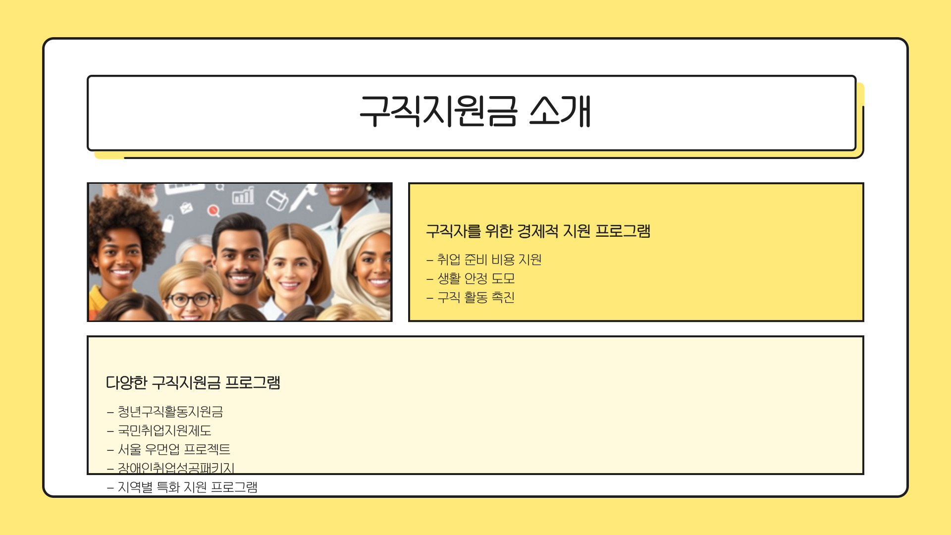 - 구직지원금은 실업자에게 경제적 지원을 제공하여 구직 활동을 촉진합니다.