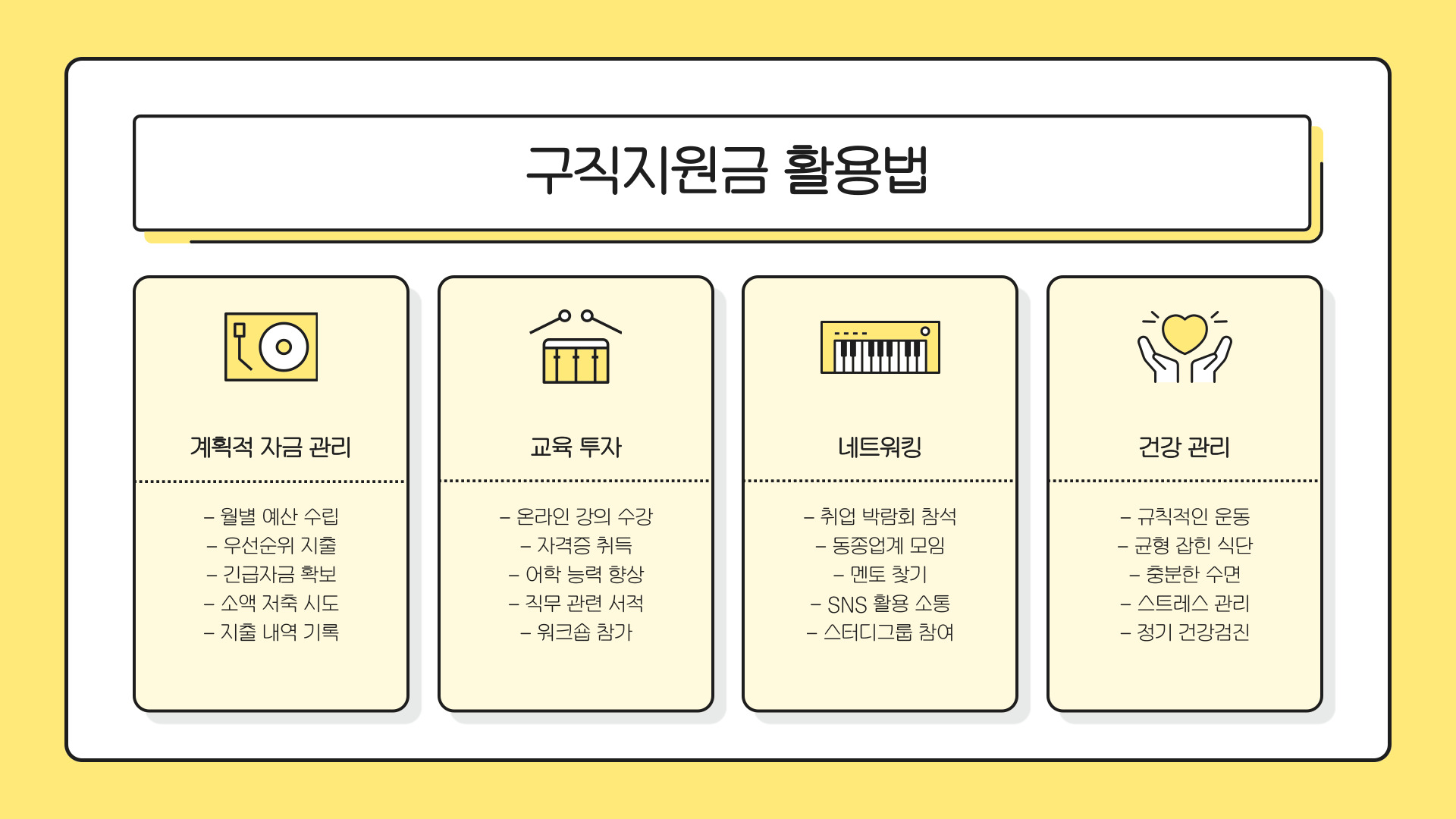 - 지원금의 한계와 주의 사항을 인지하고, 경력 개발에 집중해야 합니다.