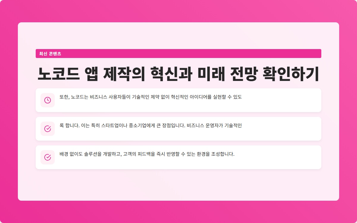 또한, 노코드는 비즈니스 사용자들이 기술적인 제약 없이 혁신적인 아이디어를 실현할 수 있도록 합니다. 이는 특히 스타트업이나 중소기업에게 큰 장점입니다. 비즈니스 운영자가 기술적인 배경 없이도 솔루션을 개발하고, 고객의 피드백을 즉시 반영할 수 있는 환경을 조성합니다.