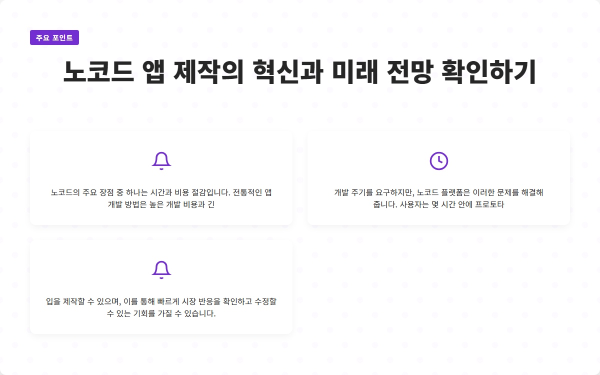 노코드의 주요 장점 중 하나는 시간과 비용 절감입니다. 전통적인 앱 개발 방법은 높은 개발 비용과 긴 개발 주기를 요구하지만, 노코드 플랫폼은 이러한 문제를 해결해 줍니다. 사용자는 몇 시간 안에 프로토타입을 제작할 수 있으며, 이를 통해 빠르게 시장 반응을 확인하고 수정할 수 있는 기회를 가질 수 있습니다.