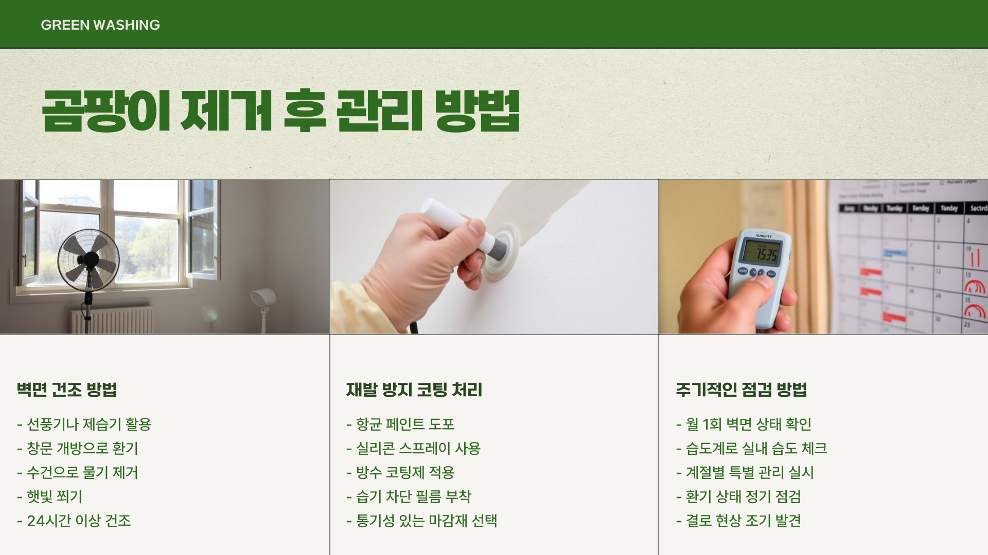 곰팡이를 제거한 후에는 다시 발생하지 않도록 예방하는 것이 중요합니다. 우선, 정기적인 청소와 점검을 실시해야 합니다. 특히 습기가 잘 모이는 화장실이나 주방의 경우, 수시로 상태를 확인하고 필요한 경우 적절한 조치를 취하세요. 또한, 벽면이 너무 습해지지 않도록 난방 및 습도 조절을 신경 써야 합니다.