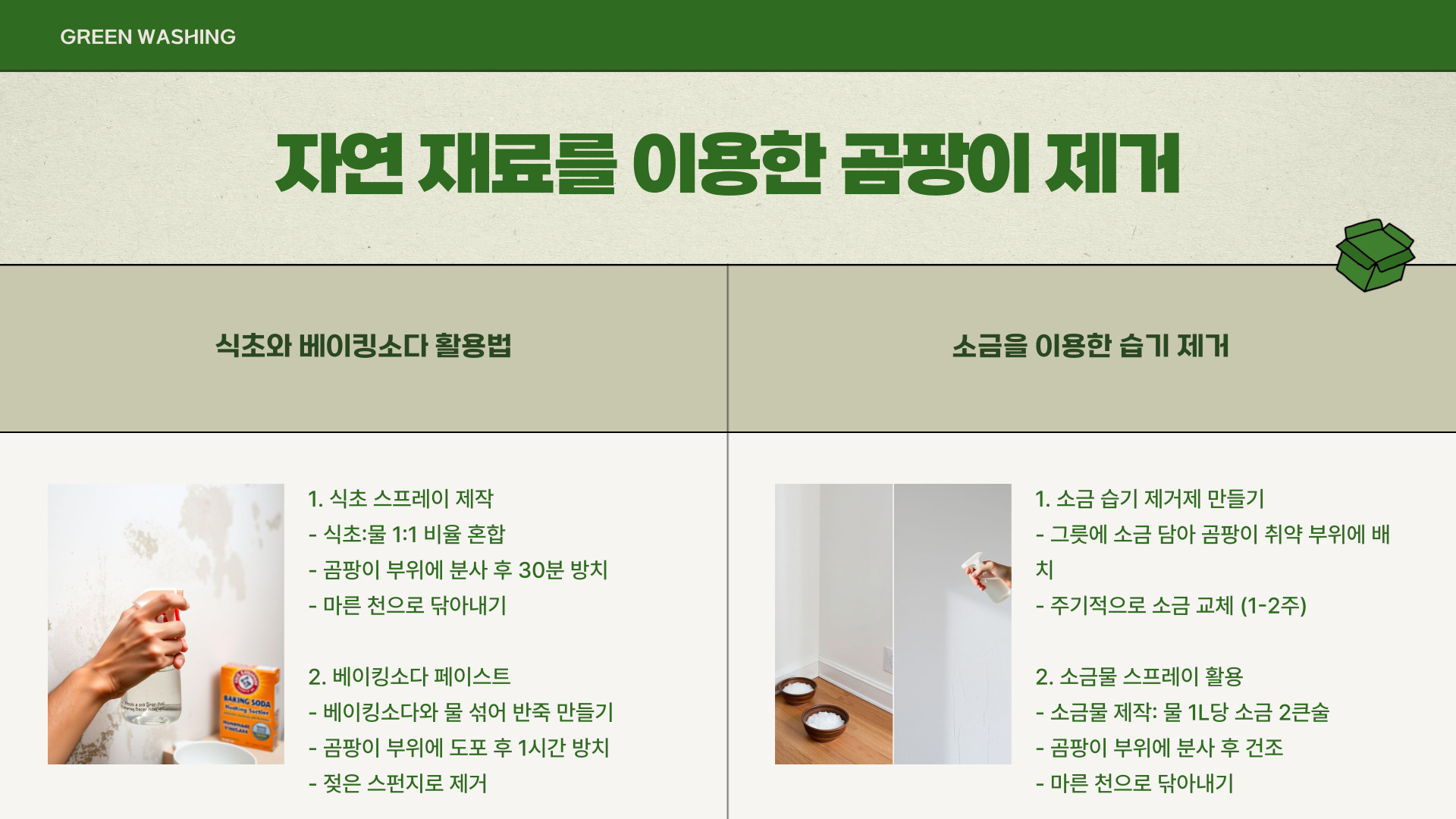 - 식초와 베이킹 소다를 활용하여 자연적으로 곰팡이를 제거하세요.
