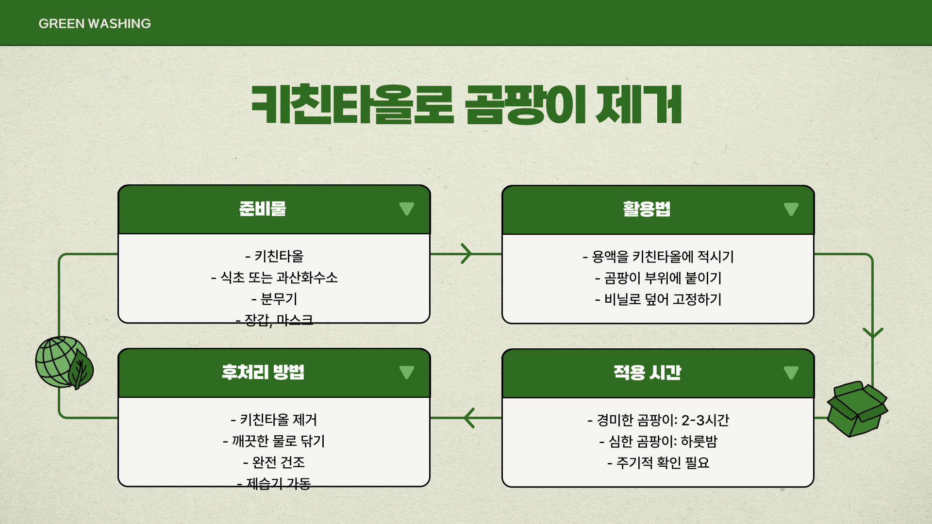 곰팡이를 제거할 때, 가장 먼저 고려해야 하는 방법 중 하나는 식초입니다. 식초는 자연적인 소독제로서 곰팡이 제거에 효과적입니다. 식초를 물과 1:1 비율로 섞어 스프레이 병에 담아 벽지에 뿌린 후, 몇 분 후에 닦아내면 됩니다. 이 방법은 강한 화학 성분이 없어 가족과 반려동물에게 안전합니다.