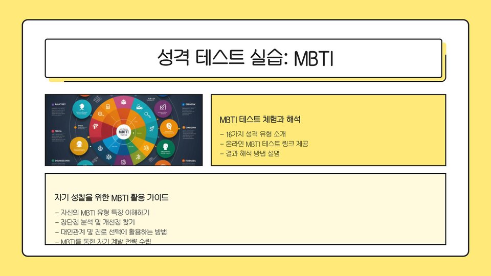 셋째, 진로 탐색에도 유용합니다. 자신의 성격과 적성을 이해함으로써, 어떤 직업이 자신에게 잘 맞는지를 판단할 수 있습니다. 마지막으로, 스트레스 관리에 도움이 됩니다. 자신의 감정 반응을 이해함으로써, 스트레스를 더 효과적으로 관리할 수 있습니다.