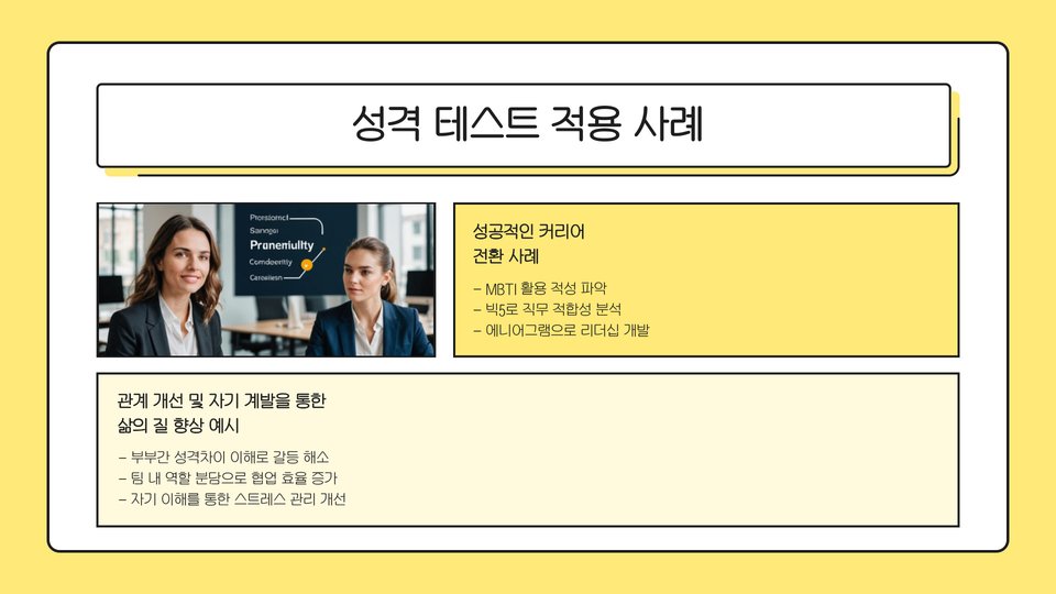 이러한 테스트는 개인적인 인사이트뿐만 아니라 직장 내 팀워크 개선, 대인 관계 증진 등 여러 방면에서 활용될 수 있습니다. 특히, 자기 이해와 타인과의 소통 능력을 높이는 데 큰 도움이 됩니다.