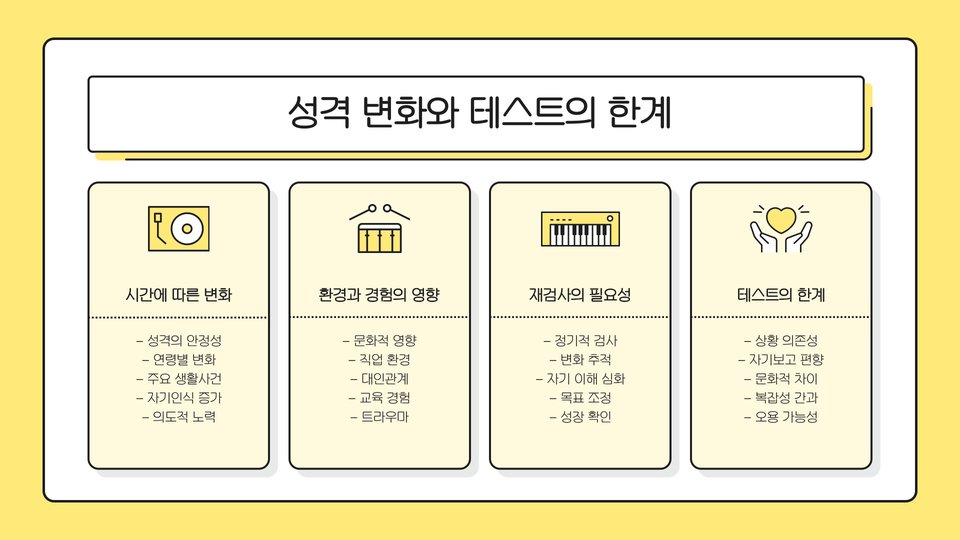 또한, 이러한 테스트는 자아 존중감을 증진시키는 데에도 기여합니다. 자신의 성격 특성을 이해함으로써, 단점을 받아들이고 장점을 부각시키는 전략을 세울 수 있습니다.