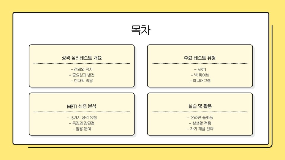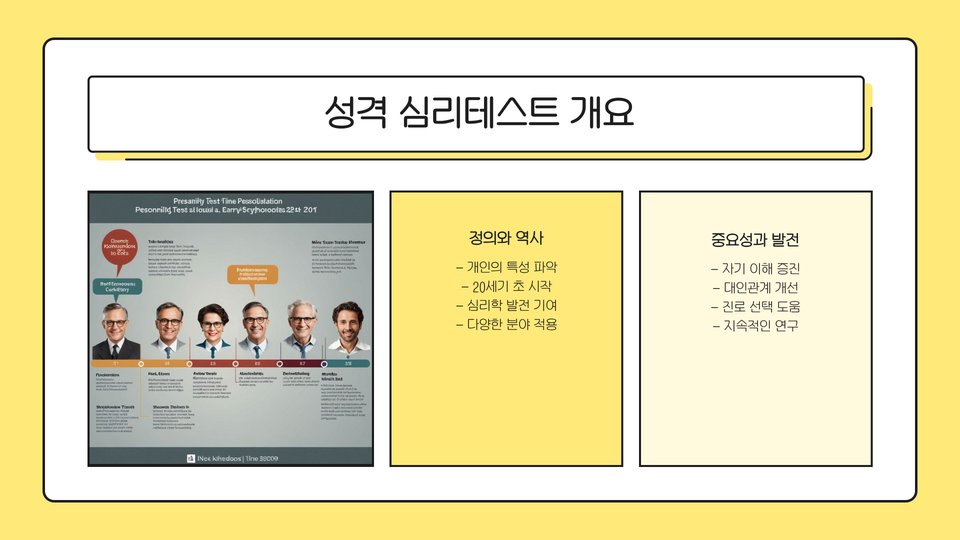- 성격 심리테스트는 개인의 성격 특성을 파악하는 도구입니다.