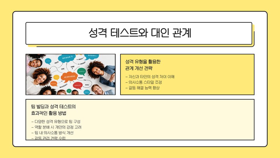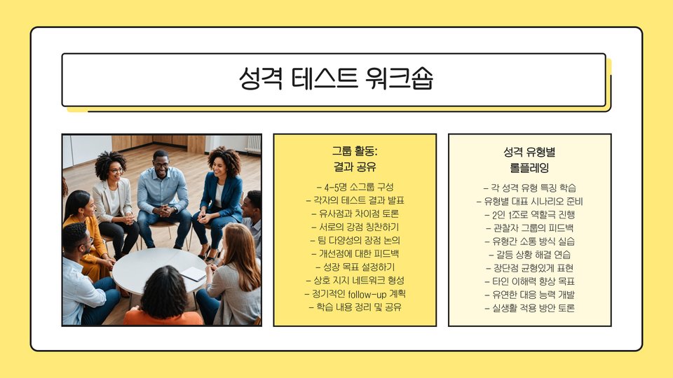 이러한 테스트는 개인적인 인사이트뿐만 아니라 직장 내 팀워크 개선, 대인 관계 증진 등 여러 방면에서 활용될 수 있습니다. 특히, 자기 이해와 타인과의 소통 능력을 높이는 데 큰 도움이 됩니다.