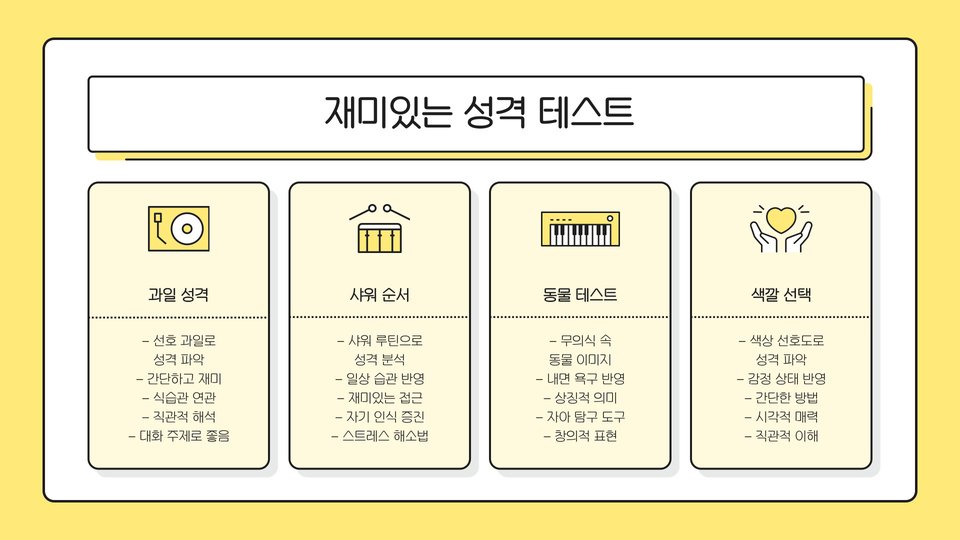 - 성격 심리테스트는 다양한 형식(예: MBTI, 에니어그램, DISC)으로 제공됨