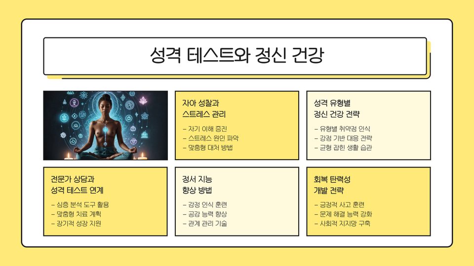성격 심리테스트는 자신을 이해하고, 타인과의 관계를 개선하는 데 큰 도움이 됩니다. 다양한 테스트 유형을 통해 자기 인식, 대인 관계 개선, 진로 탐색 등을 할 수 있습니다. 또한, 재미있고 창의적으로 이를 활용할 수 있는 방법도 많습니다. 이러한 심리테스트를 통해 더욱 풍부한 삶을 누리시길 바랍니다.