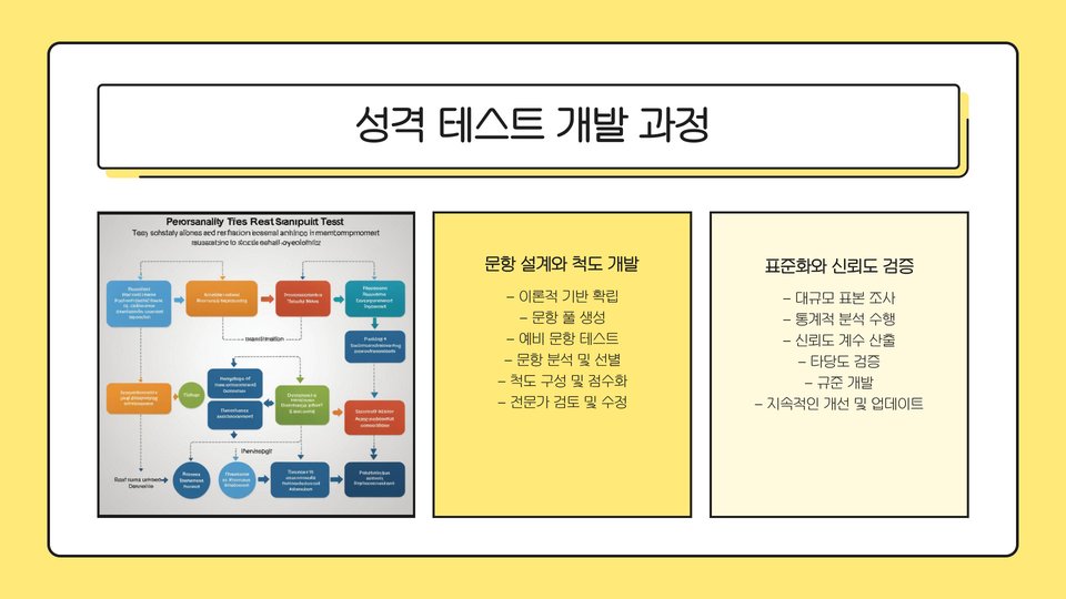 성격 심리테스트는 개인의 성격 특성을 파악하기 위해 설계된 평가 도구입니다. 이러한 테스트는 다양한 질문을 통해 응답자의 심리적 특징을 분석하여, 그 결과를 바탕으로 성격 유형이나 경향성을 도출합니다. 심리학자들은 이러한 테스트를 통해 사람의 행동 패턴, 감정 반응, 대인 관계 스타일 등을 이해할 수 있습니다. 예를 들어, MBTI, 에니어그램, 디스크 테스트 등이 대표적인 성격 심리테스트로 널리 알려져 있습니다.