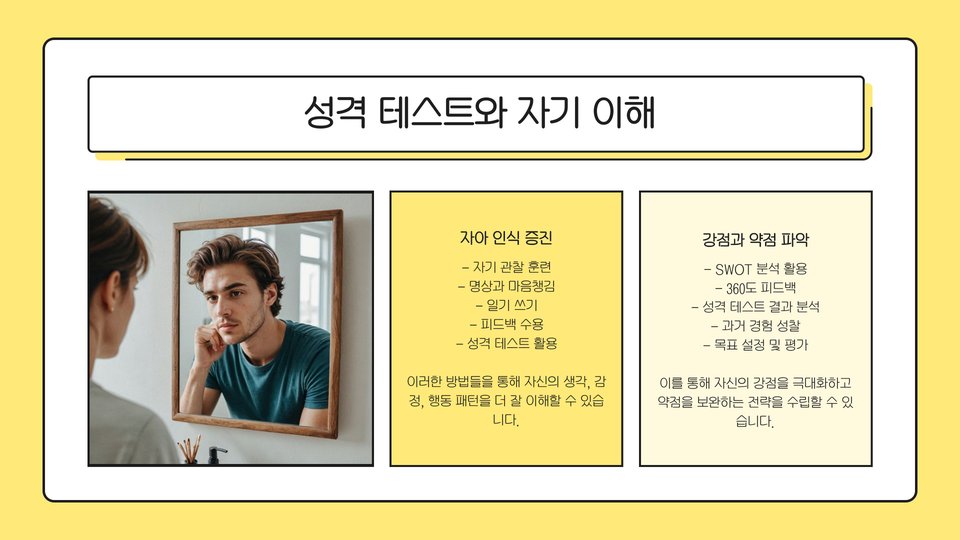 예를 들어, MBTI 검사를 통해 자신의 성격 유형을 알고, 다른 유형의 사람들과 어떻게 상호작용할 수 있는지를 배우는 것은 해당 분야의 전문성을 키우는 데 큰 도움이 됩니다.