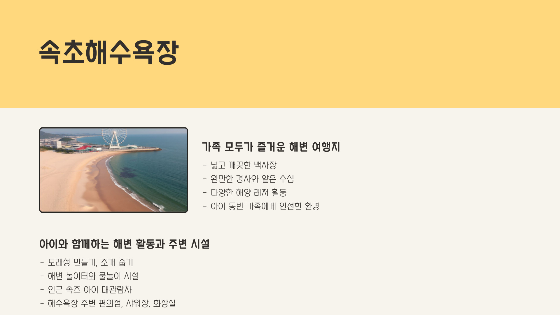 - 속초 해수욕장은 아이들이 안전하게 놀 수 있는 공간입니다.