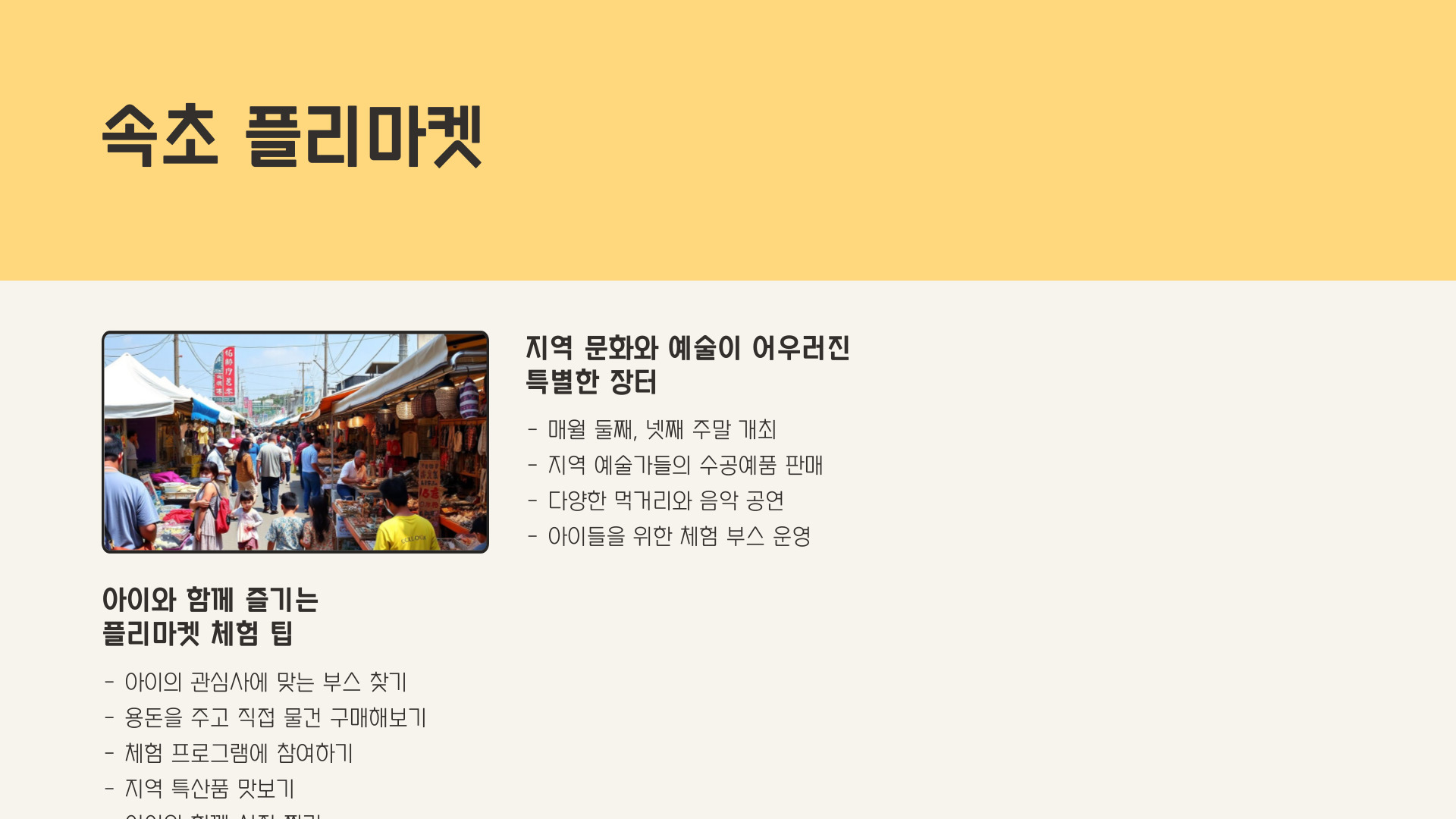 속초는 아이들과 함께 즐길 수 있는 다양한 명소와 활동이 있습니다. 해수욕장, 아쿠아리움, 설악산, 그리고 중앙시장 등은 모두 가족 여행에 적합한 장소입니다. 이곳에서의 특별한 경험은 아이들에게 소중한 추억으로 남을 것입니다. 각 장소 방문 시 안전과 건강을 최우선으로 고려하세요.
