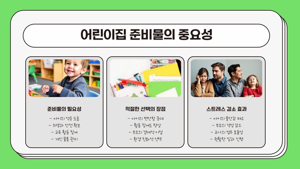 어린이집에 가는 아이들을 위한 준비물은 선택의 폭이 넓고, 각 아이의 필요에 따라 다르게 준비해야 합니다. 특히, 어린이집 준비물은 아이의 안전과 편안함을 고려하여 꼭 필요한 품목을 엄선해야 합니다. 이번 글에서는 애정 어린 시선으로 아이가 행복하게 어린이집생활을 할 수 있도록 돕는 꼭 필요한 준비물 베스트 3를 소개합니다. 각 준비물의 특징과 장단점을 자세히 분석하겠습니다.