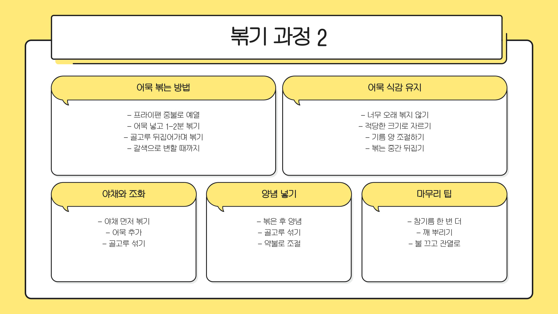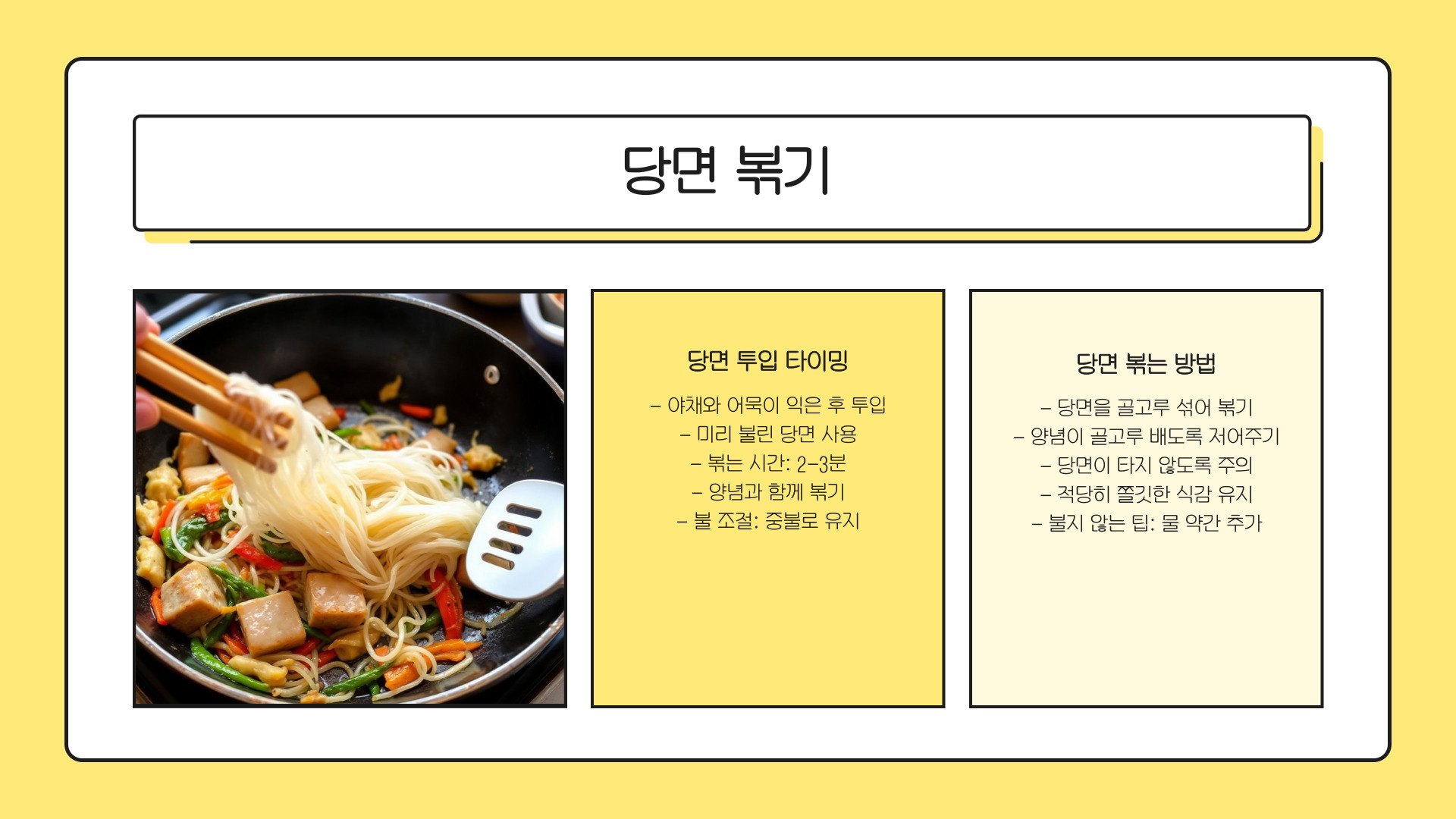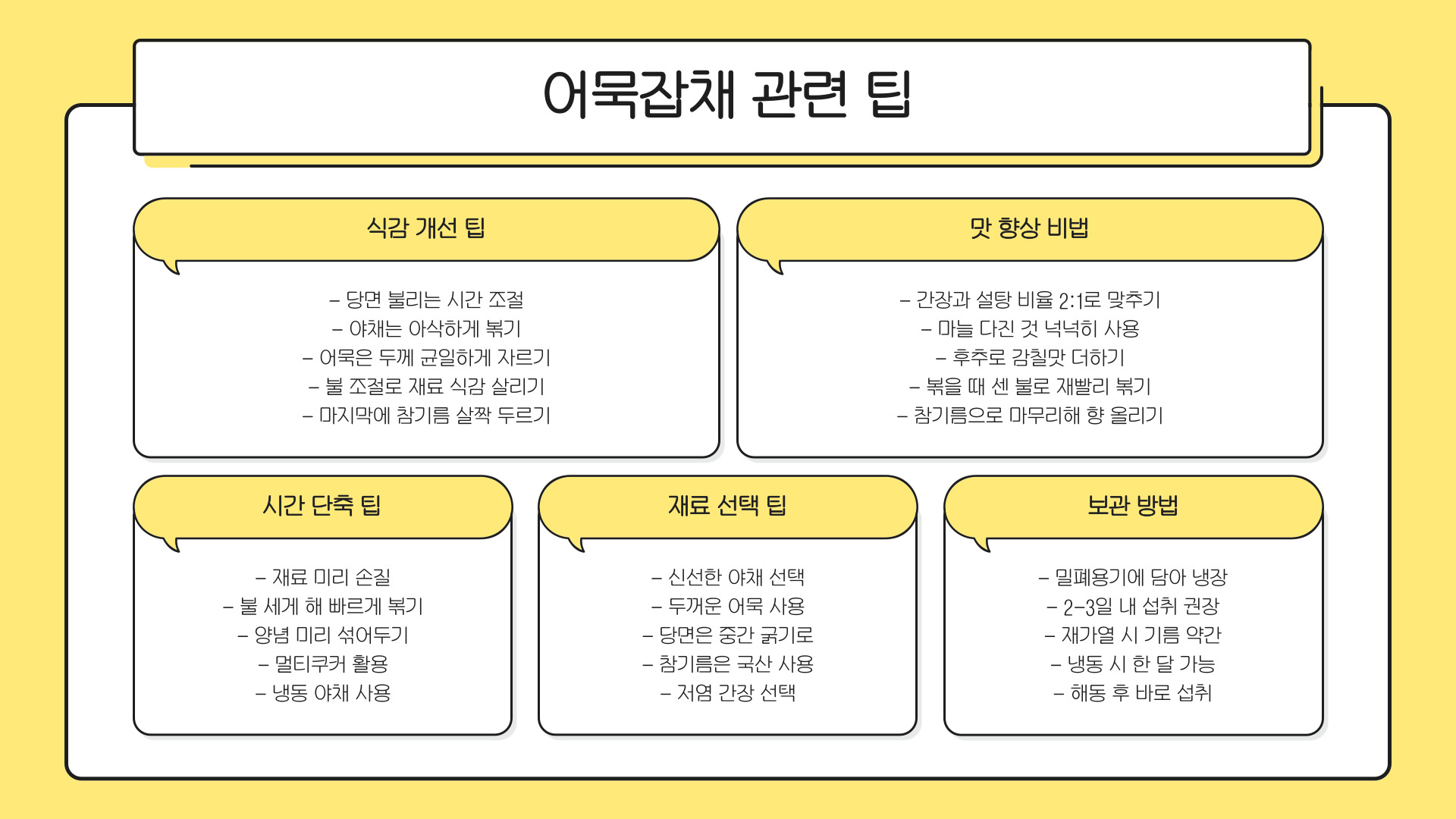 중요 팁: 어묵잡채는 재료가 골고루 섞이도록 볶는 것이 포인트입니다. 각 재료의 식감을 살릴 수 있도록 주의하세요!