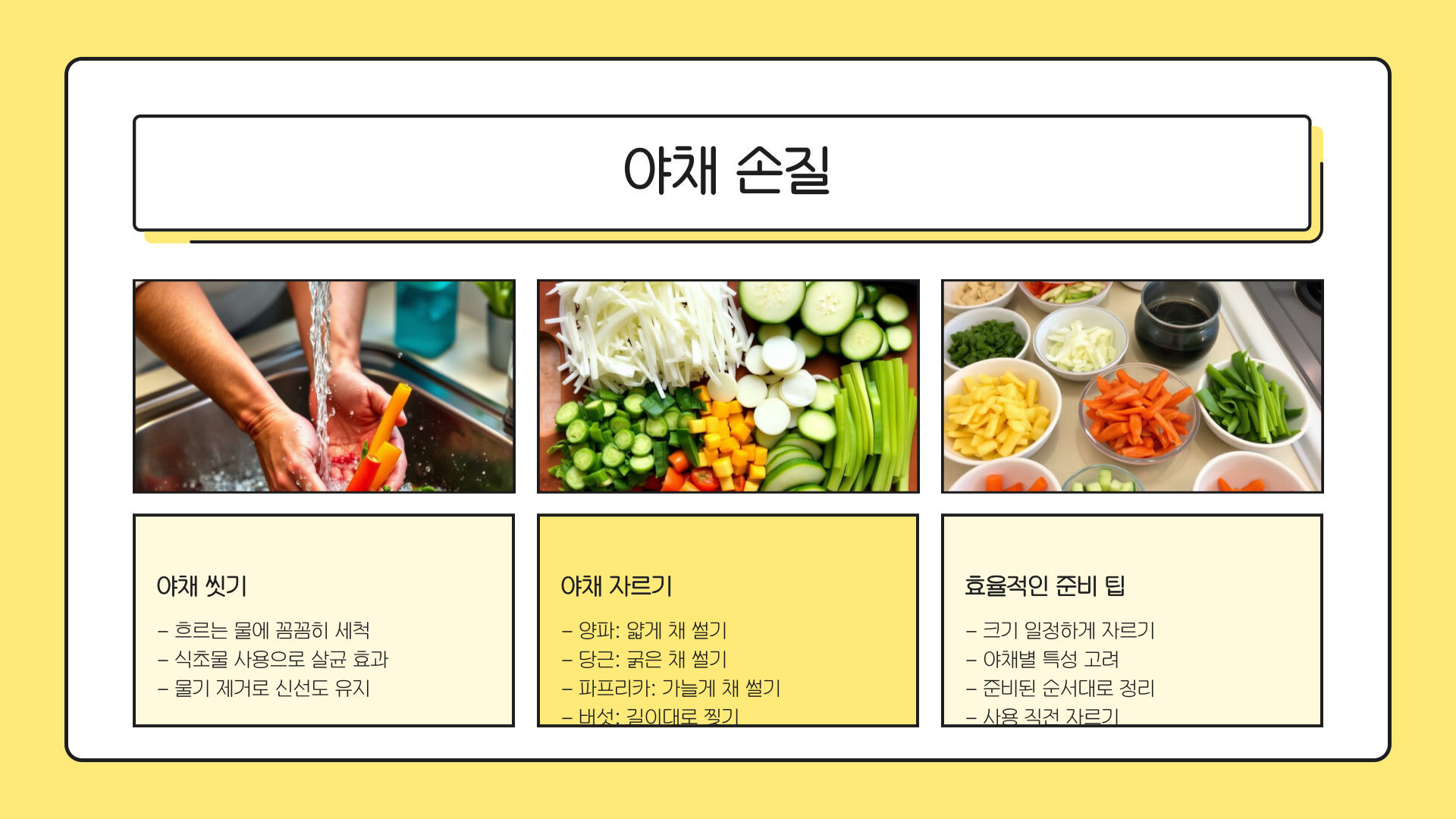 자, 이제 본격적으로 조리를 시작해 볼까요? 첫 단계는 재료 손질입니다. 양파, 당근, 파프리카는 적당한 크기로 썰어 주고, 대파는 송송 썰어 줄 필요가 있습니다. 이 때, 색깔이 다양한 채소를 사용하면 시각적으로도 풍성한 느낌을 줄 수 있습니다. 재료 손질이 끝난 후, 팬에 기름을 두르고 재료를 볶아줍니다.