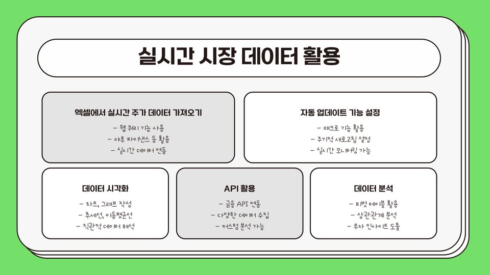 실시간 시장 동향을 분석하는 것은 투자 전략을 세우는 데 필수적입니다. 투자자는 시장의 변화를 신속하게 파악함으로써 더욱 효과적인 결정을 내릴 수 있습니다. 이를 위해 엑셀의 데이터 가져오기 기능을 활용하여 외부 데이터 소스에서 시장 정보를 실시간으로 가져오는 것이 가능합니다. 예를 들어, 주식 데이터, 환율 변동 등을 자동으로 업데이트하여 투자 판단에 필요한 정확한 정보를 유지할 수 있습니다.