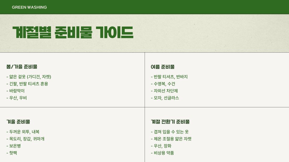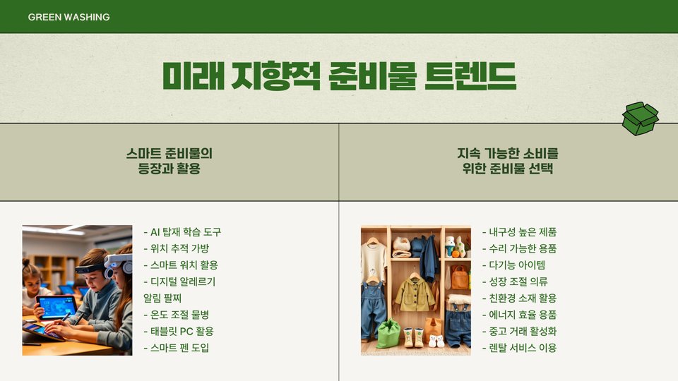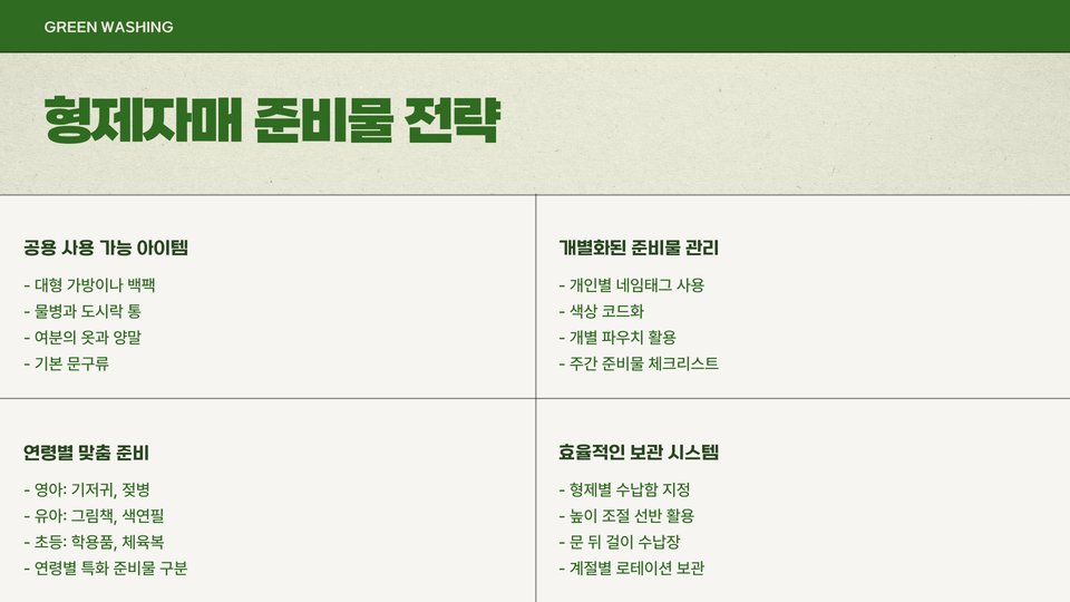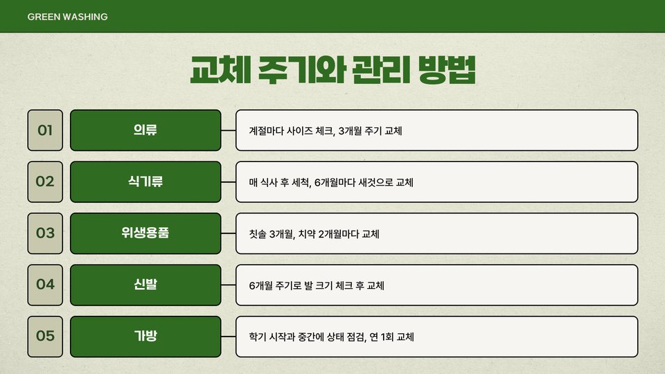 | 정기적 관리 | 아이의 성장에 맞 인해 준비물을 주기적으로 점검하고 교체합니다. |