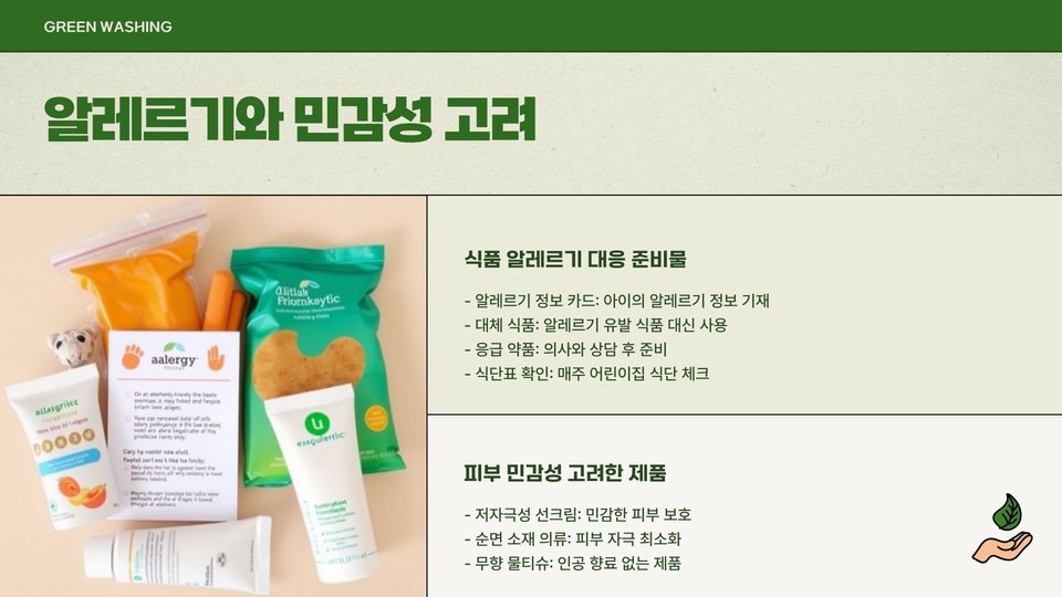 또한, 친환경 제품이나 자연 유래 성분으로 만든 제품을 선택하는 것도 좋은 방법입니다. 이렇게 하면 아이의 피부가 더 편안하고 발진 등의 문제를 예방할 수 있습니다. 예를 들어, 유기농 비누나 자연성분 치약이 적합할 것입니다. 그리고 가벼운 옷이나 신발은 아이가 쉽게 접촉할 수 있어 중요한 역할을 합니다.