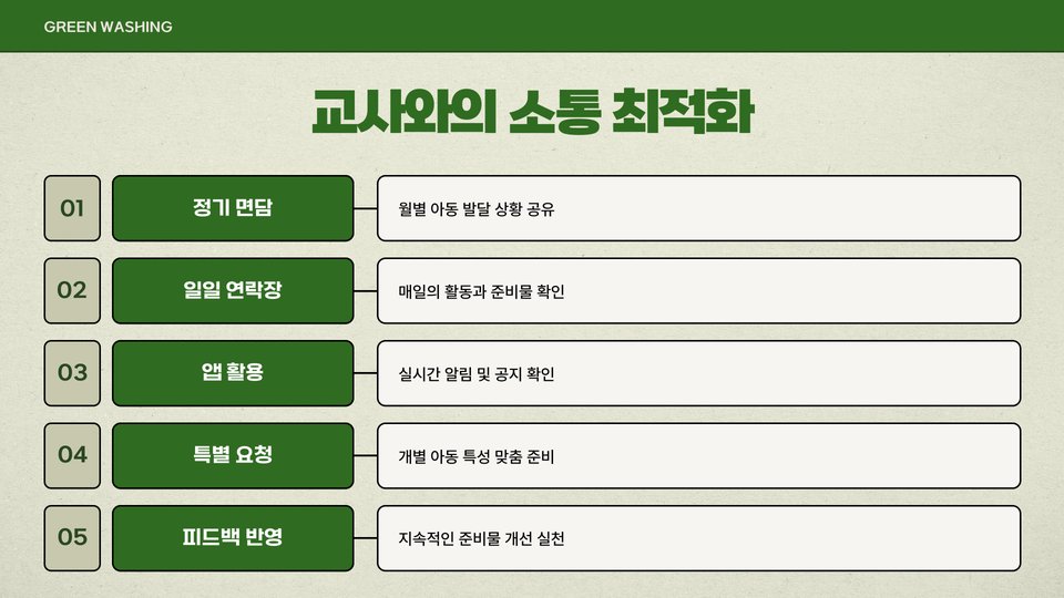 중요한 팁: 항상 준비물 리스트를 재확인하고 아이의 필요에 따라 조정하세요. 어린이집 생활이 즐거운 경험이 될 수 있도록 돕는 것이 부모님의 역할입니다.