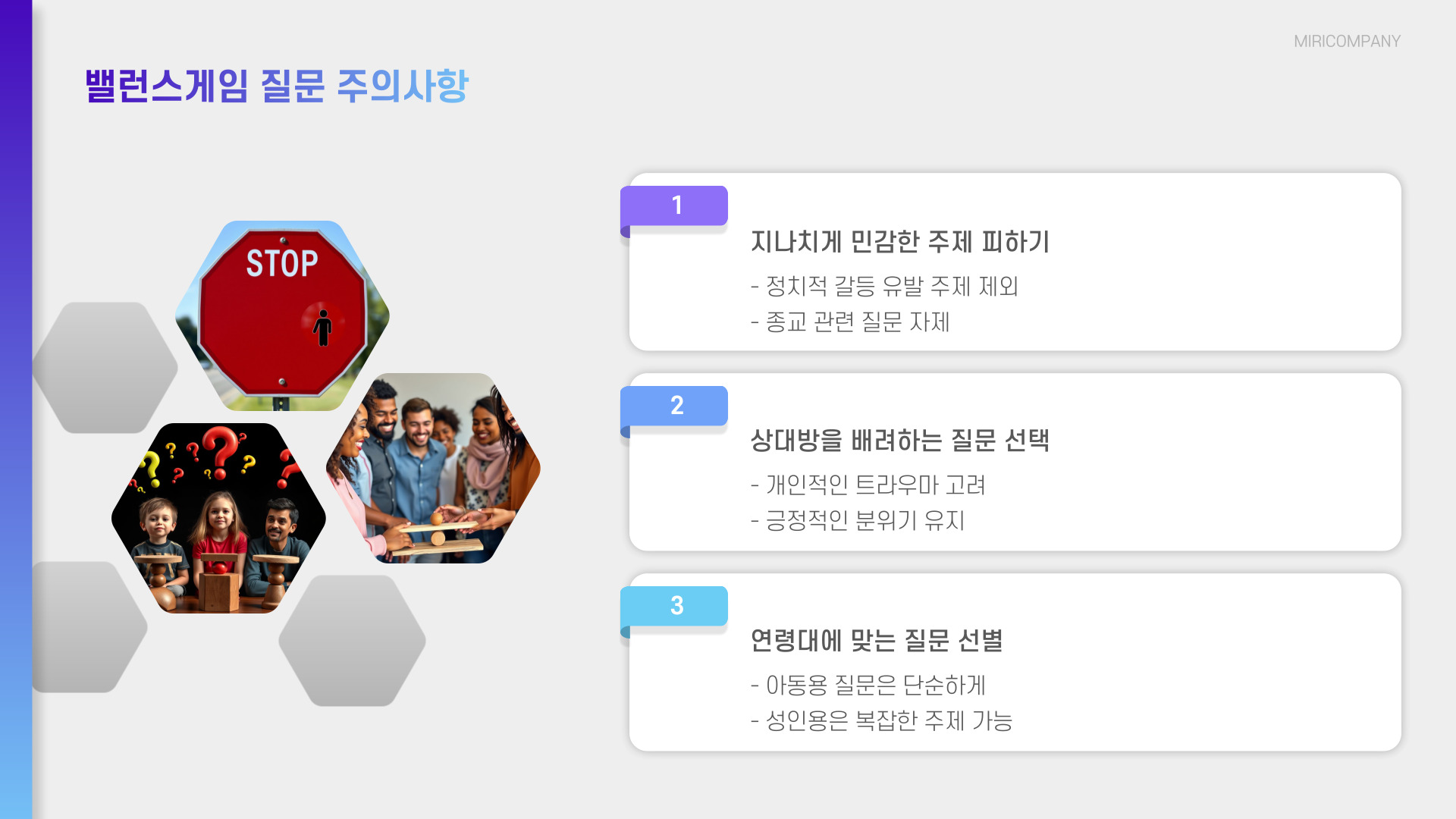 - 질문 선택 시 상대방의 성격과 취향을 고려해야 한다.