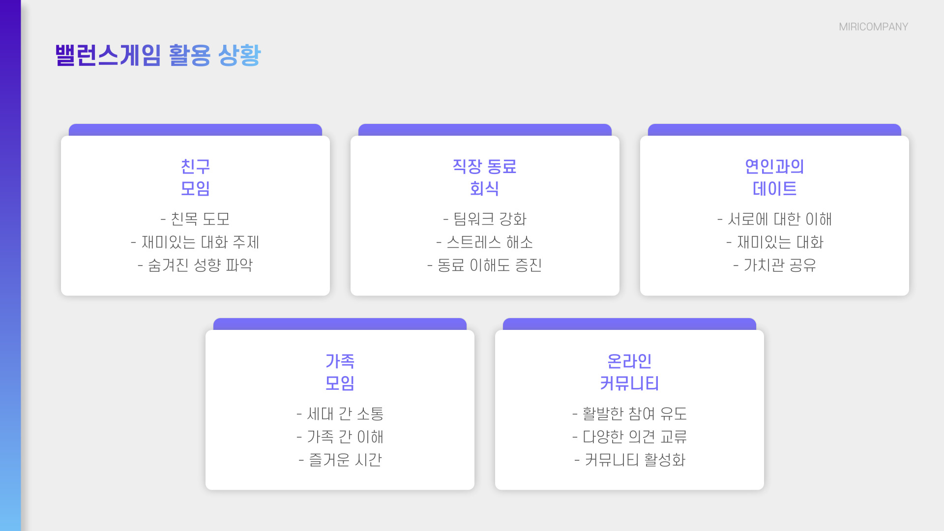| 유대감 증진 | 밸런스게임은 친구들과의 유대감을 높임 |