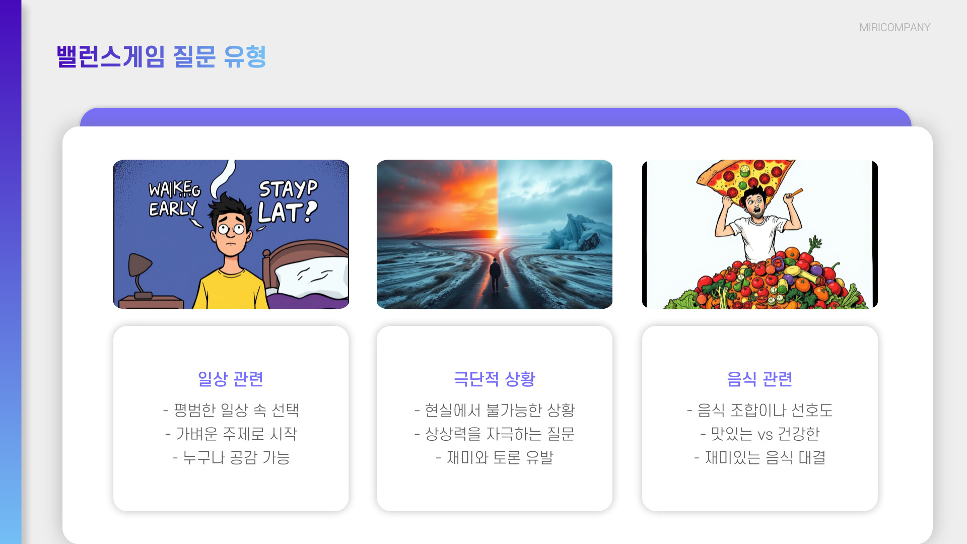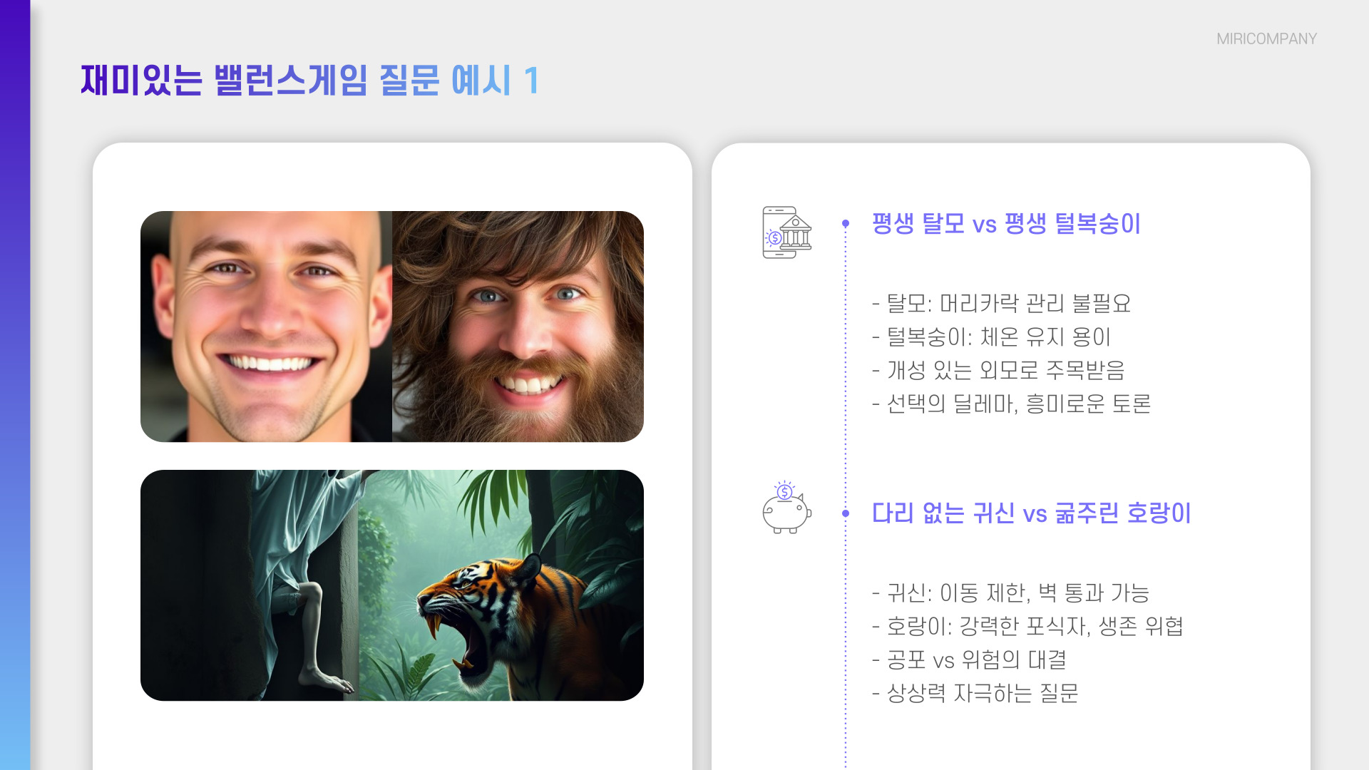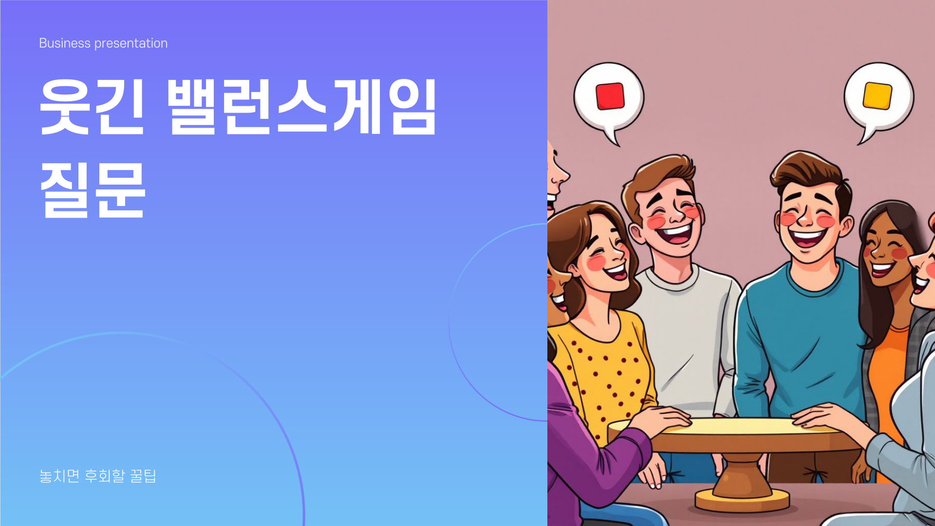 Tags: 밸런스게임, 웃긴 질문, 친구 모임, 유머, 대화, 소통, 게임, 즐거운 시간, 파티, 재미있는 질문