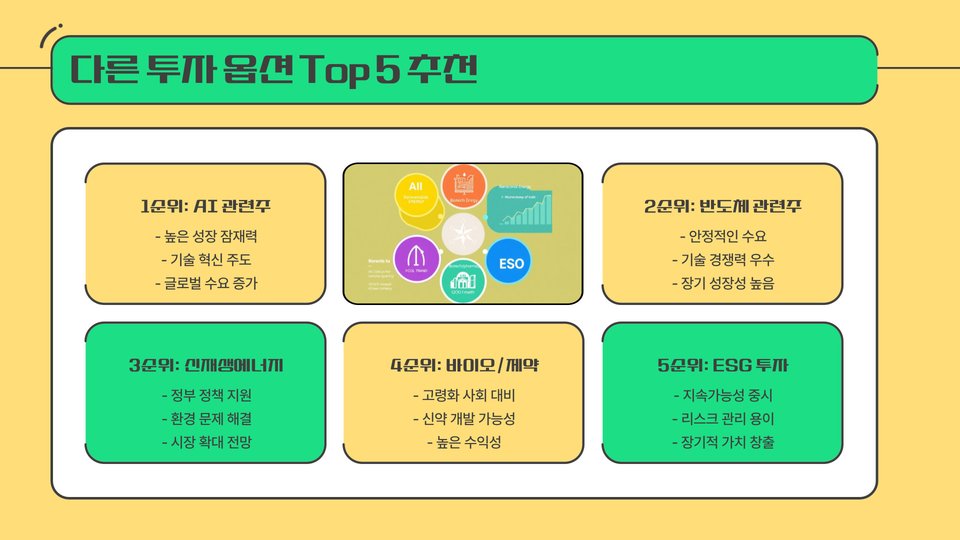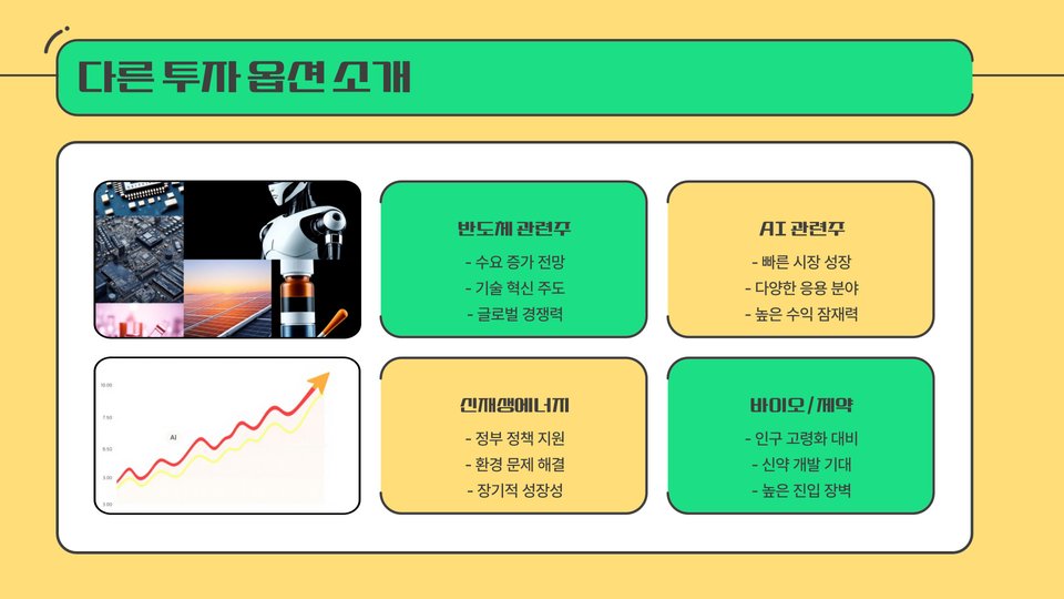 그렇다면 유리기판 관련주 외에 어떤 투자 옵션이 있을까요? 전통적인 주식, ETF, 부동산 투자 등이 있습니다. 유리기판 관련주는 기술 산업의 성장과 밀접하게 연결되어 있어 다른 옵션보다 더 높은 수익성을 기대할 수 있습니다.