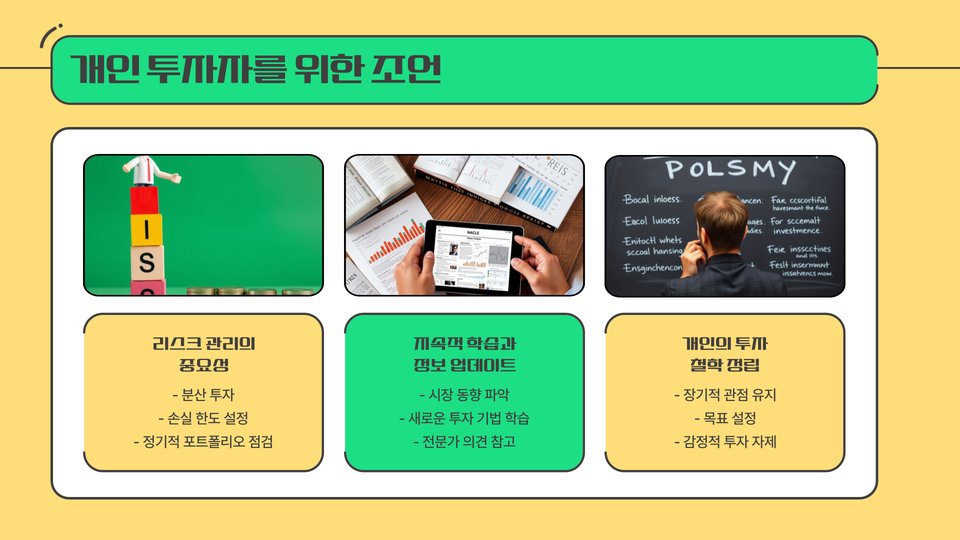 둘째, 분산 투자를 통해 리스크를 줄이는 것도 좋은 전략입니다. 여러 기업에 투자함으로써 특정 기업의 성과에 의존하지 않게 됩니다. 또한, 장기적인 관점에서 접근하는 것이 필요합니다.