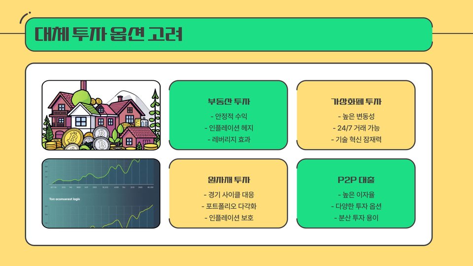 - 부동산 투자: 안정적인 수익 창출 가능하지만 장기적인 투자 필요