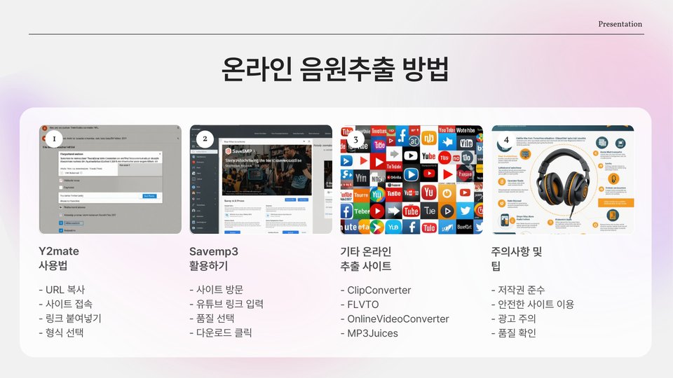 - 온라인 변환기 사용: 웹사이트에서 링크를 입력하여 음원을 다운로드.