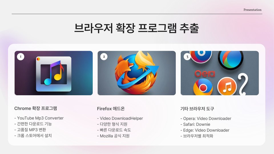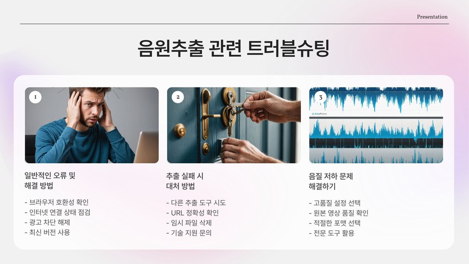 유튜브 음원추출이란, 유튜브에서 제공하는 동영상에서 오디오 트랙을 분리하여 활용 가능한 형태로 변환하는 과정을 의미합니다. 보통은 음악을 듣거나 배경 음악을 제작 시 사용하게 됩니다. 이 과정을 통해 동영상 콘텐츠의 음성을 보다 쉽게 가져올 수 있습니다. 유튜브 음악 이용 시 유용한 툴이 많이 있지만, 적법한 경로를 통해 사용하는 것이 중요합니다.