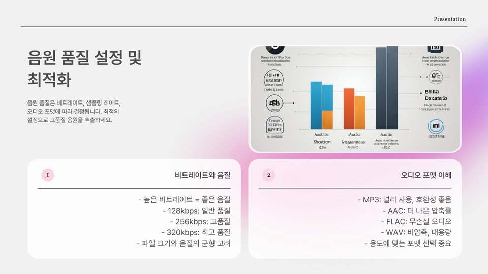 또한, 음원 추출 후 파일 형식을 선택할 때는 사용 목적에 맞는 포맷을 반드시 선택해야 합니다. 음원의 품질과 크기를 고려하여, 사용자가 원하는 방식으로 최적화하는 것이 필요합니다. 비트레이트를 조절함으로써 품질을 향상시킬 수 있습니다.