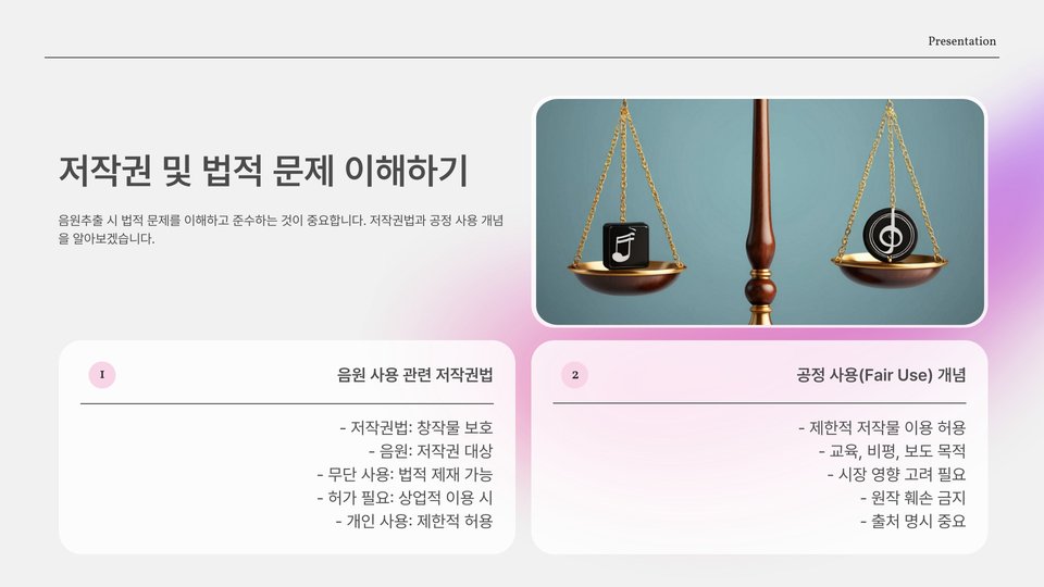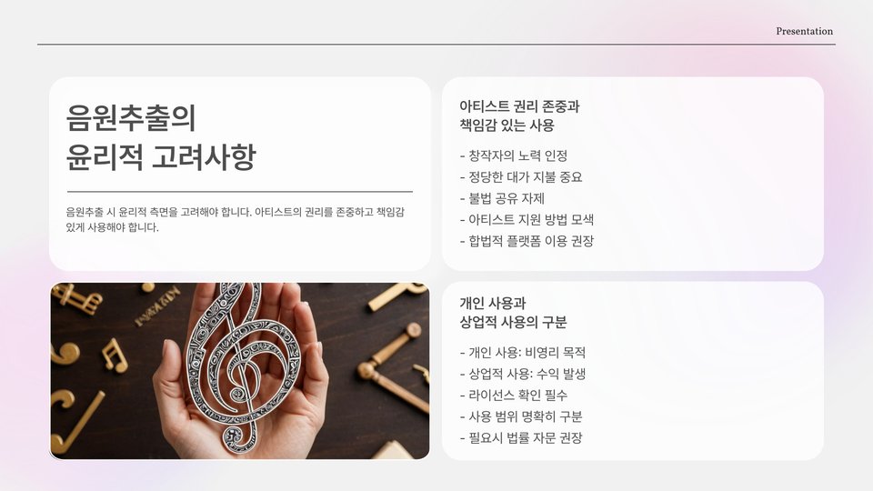둘째, 저작권이 없는 음원이나 사용 허가가 있는 음원을 선택하는 것이 좋습니다. 이를 통해 법적인 문제를 피할 수 있습니다. 마지막으로, 항상 추출한 음원을 개인적인 용도로만 사용하고, 상업적인 용도로는 사용하지 않도록 주의해야 합니다.