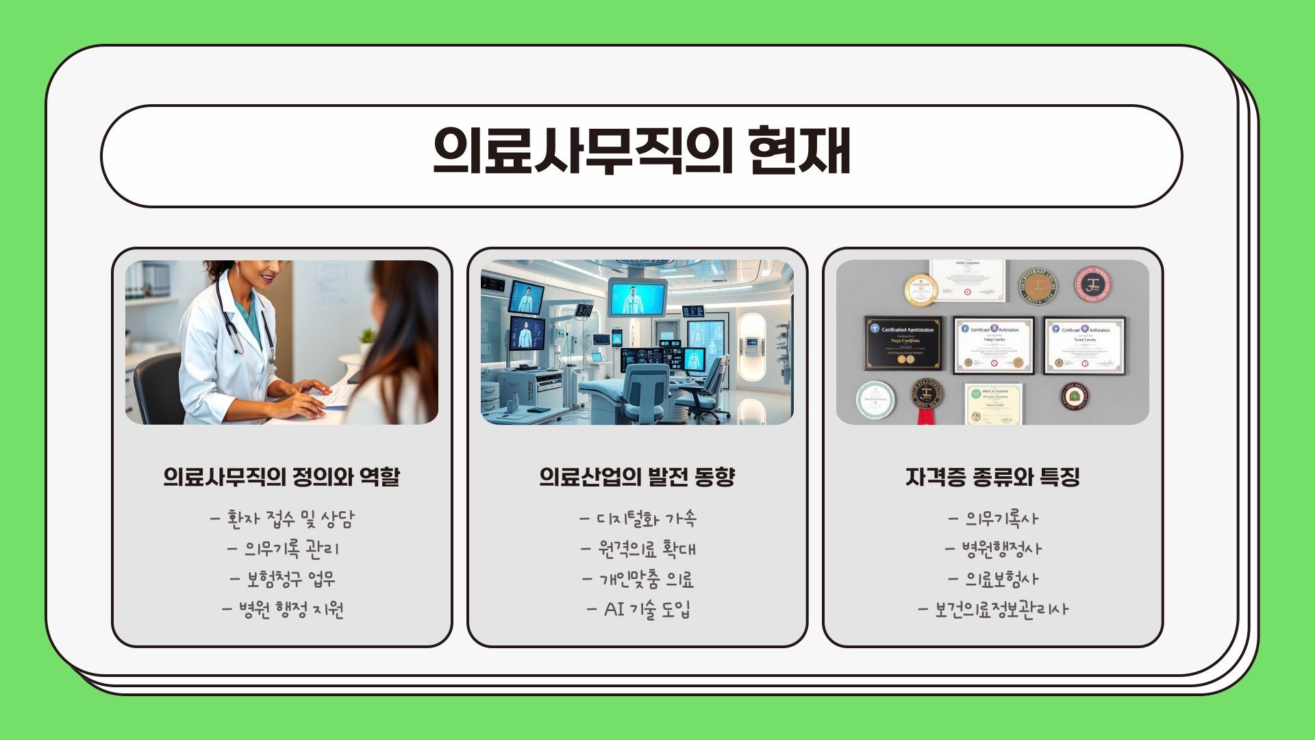 - 의료사무직 자격증 소지자는 취업 시장에서 높은 경쟁력을 갖추게 된다.