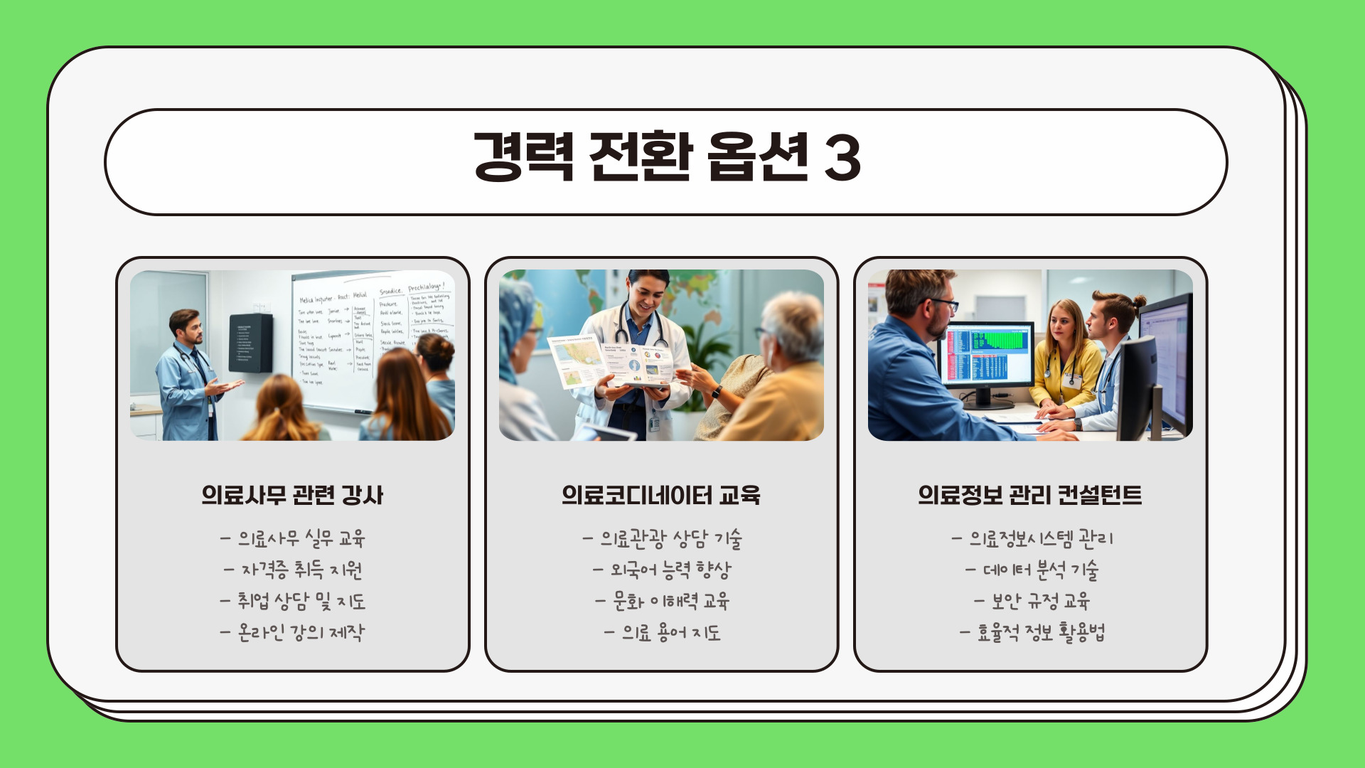 의료사무직은 환자 관리, 데이터 관리, 보험 청구 등 다양한 업무를 포함합니다. 특히, 의료정보의 디지털화가 진행되면서, 의료사무직의 수요는 더욱 증가하고 있습니다. 앞으로 5년간 의료기관에서는 효율적인 데이터 관리를 통해 환자 치료의 질을 높이는 데 중점을 두게 될 것입니다. 이는 의료사무직 자격증 소지자에게 더 많은 기회를 제공할 것입니다.
