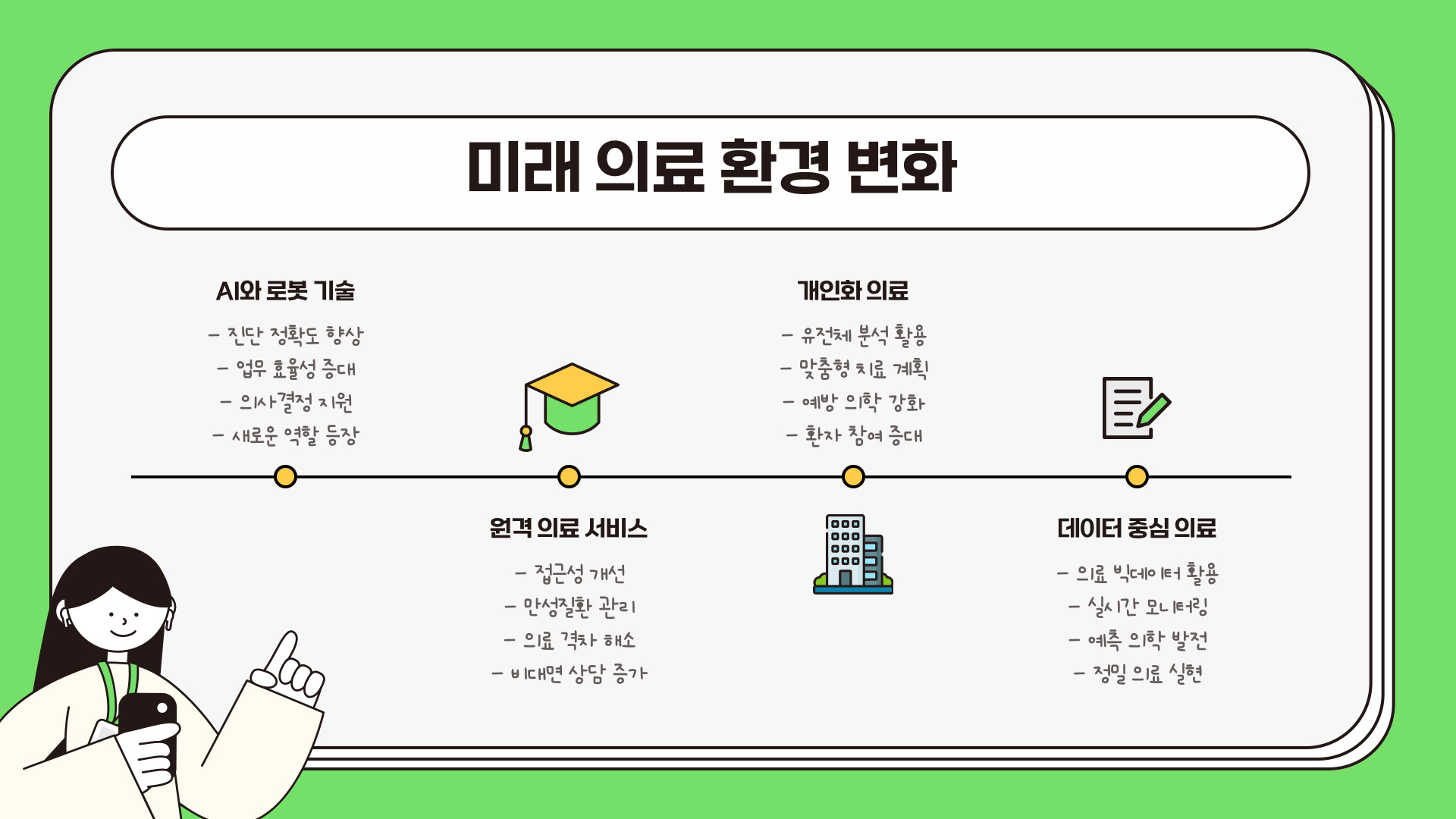 5년 후에는 의료사무직의 환경이 크게 변화할 것으로 예상됩니다. 기술 발전에 따라 나의 역할이 변화할 수 있으며, 이러한 변화에 적응하는 것이 중요합니다. 특히 빅데이터와 AI 기술의 발전은 의료 데이터 관리에 새로운 패러다임을 제시할 것입니다. 이러한 변화를 예측하고 관련 기술을 학습하는 것은 여러분의 커리어에 중요한 영향을 미칩니다.