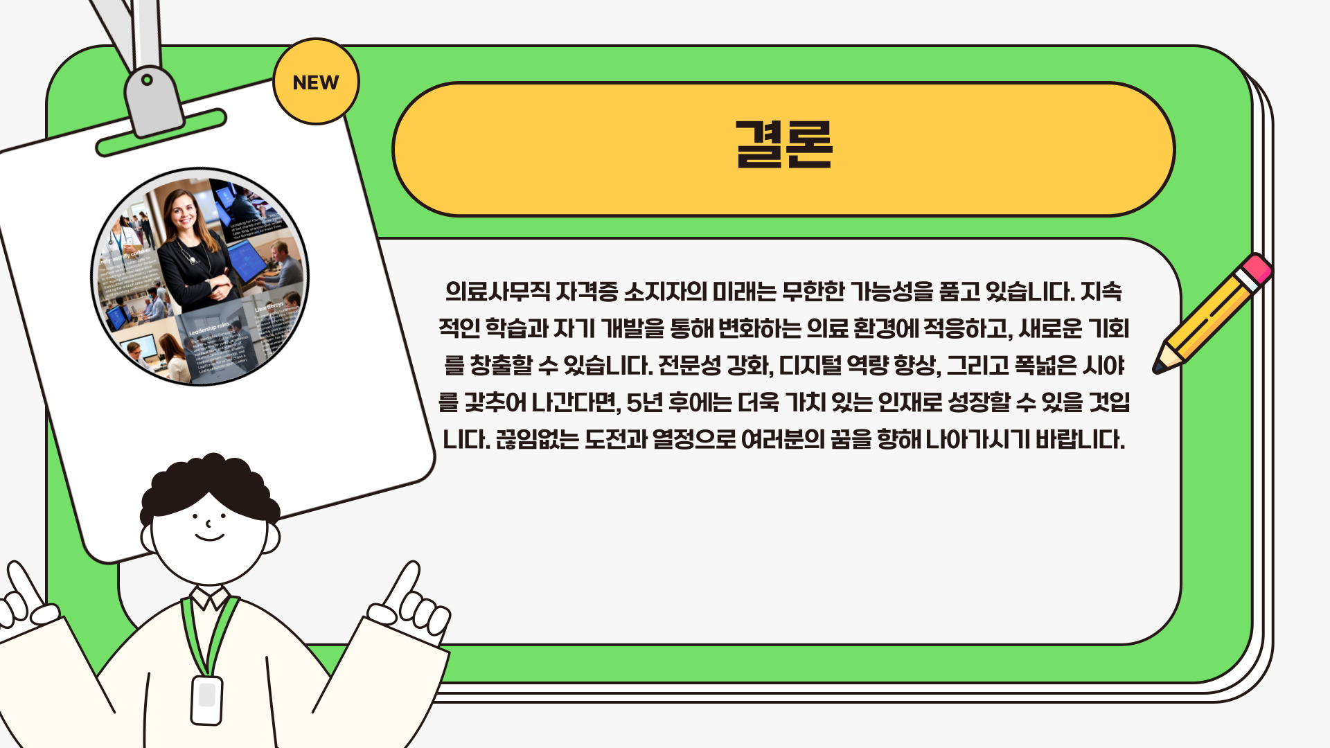 의료사무직 자격증을 소지한 여러분은 앞으로의 경력에 대해 많은 선택의 기회를 가지게 될 것입니다. 5년 후, 당신은 어디에 있을까요? 목표를 세우고, 네트워킹을 하고, 지속적으로 학습하면서 성공적인 경로를 그려나가길 바랍니다. 여러분의 노력은 분명히 미래에 좋은 결과로 이어질 것입니다.
