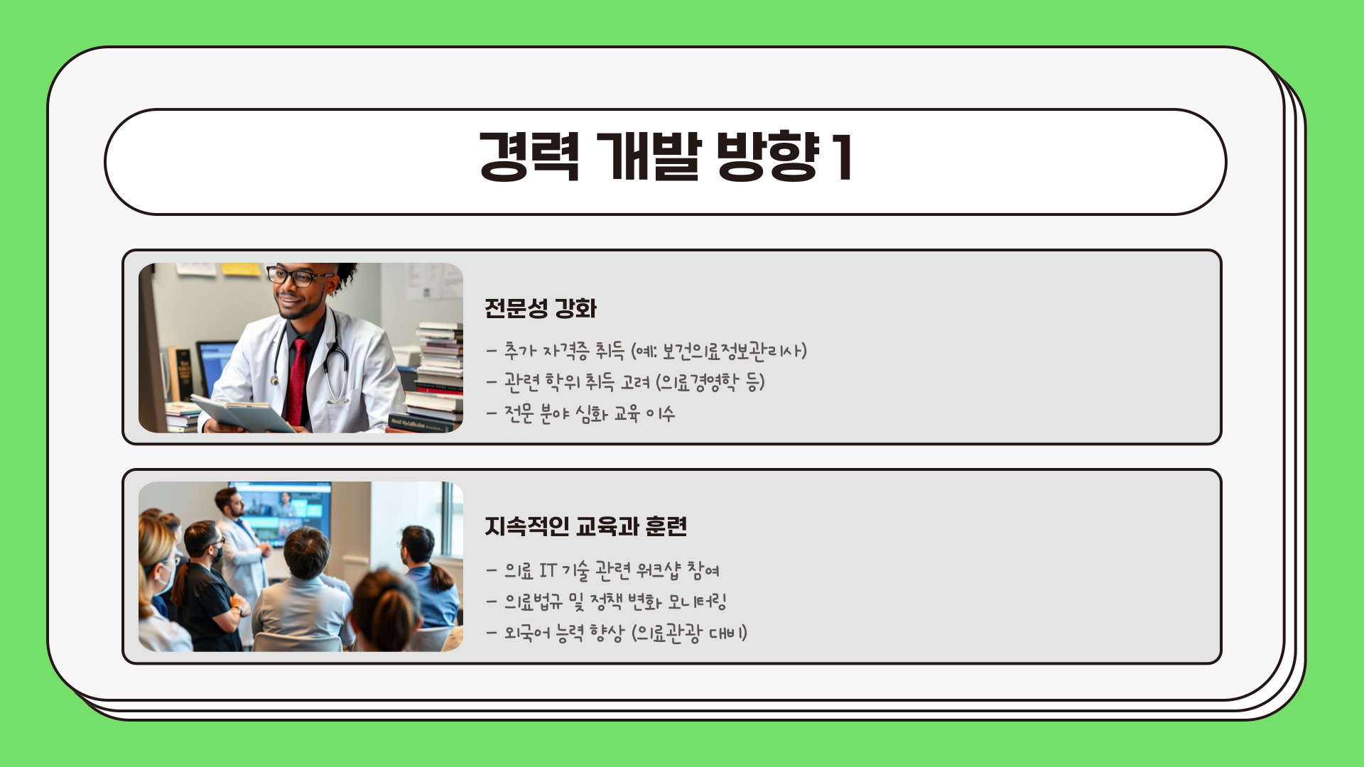 둘째, 향후 5년 동안 여러분이 직업적으로 나아가야 할 방향은 지속적인 자기 개발입니다. 예를 들어, 의료정보학에 대한 폭넓은 이해는 의료사무직 자격증 소지자에게 유리합니다. 이러한 학습을 통해 더 높은 직책인 데이터 관리자나 의료 경영진으로 나아갈 수 있는 기회를 잡을 수 있습니다.