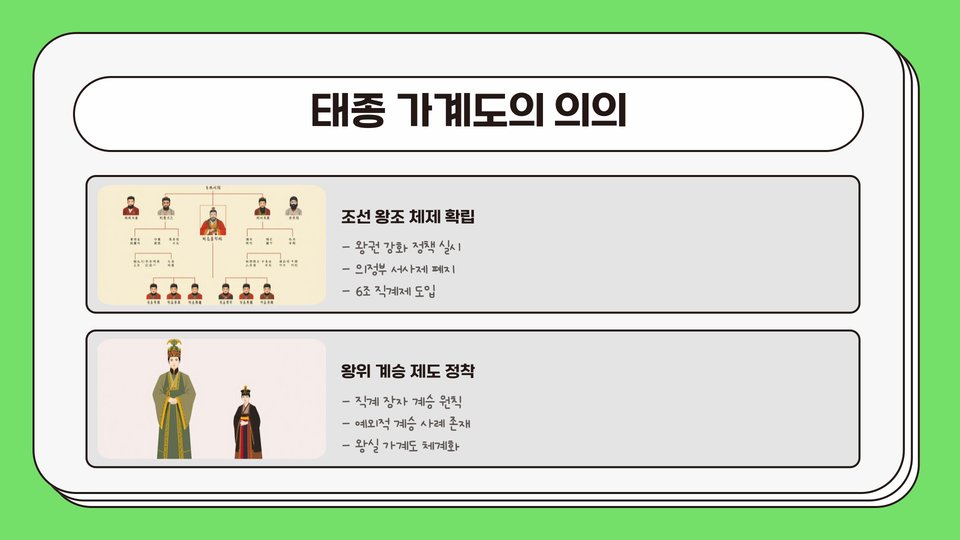 이방원의 가계도는 단순한 가족 관계를 넘어 조선 왕조의 역사적 중요성을 보여줍니다. 이 가계도를 통해 우리는 조선 초기에 발생한 정치적 변동과 권력 다툼을 이해할 수 있습니다. 이방원은 권력의 중심에서 자신의 입지를 확고히 하기 위해 많은 정치적 노력을 기울였으며, 이 과정은 가계도에 반영되어 있습니다.