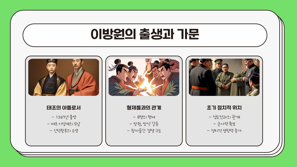이방원은 조선의 태조 이성계의 둘째 아들로, 후에 조선의 제3대 왕인 태종이 됩니다. 그의 가계도는 조선 왕조의 중요한 역사적 사건들을 이해하는 데 필수적인 요소입니다. 이방원의 가계도는 인물 간의 관계를 명확히 하고, 그들의 정치적 및 사회적 역학을 분석하는 데 도움을 줍니다. 이방원의 가계도에는 그의 부모, 형제, 자녀들이 포함되어 있으며, 각 인물의 역할과 영향력은 매우 중요합니다.