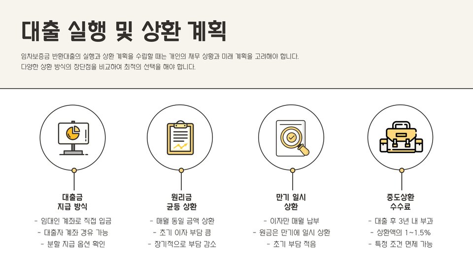 임차보증금 반환대출을 받은 후에는 상환 방법에 대해 이해해야 합니다. 일반적으로 대출은 원리금균등상환 또는 원금균등상환 방식으로 이루어집니다. 원리금균등상환 방식은 매달 같은 금액을 상환하는 방식이고, 원금균등상환 방식은 매달 원금을 일정하게 상환하며 이자는 잔액에 따라 달라지는 방식입니다.