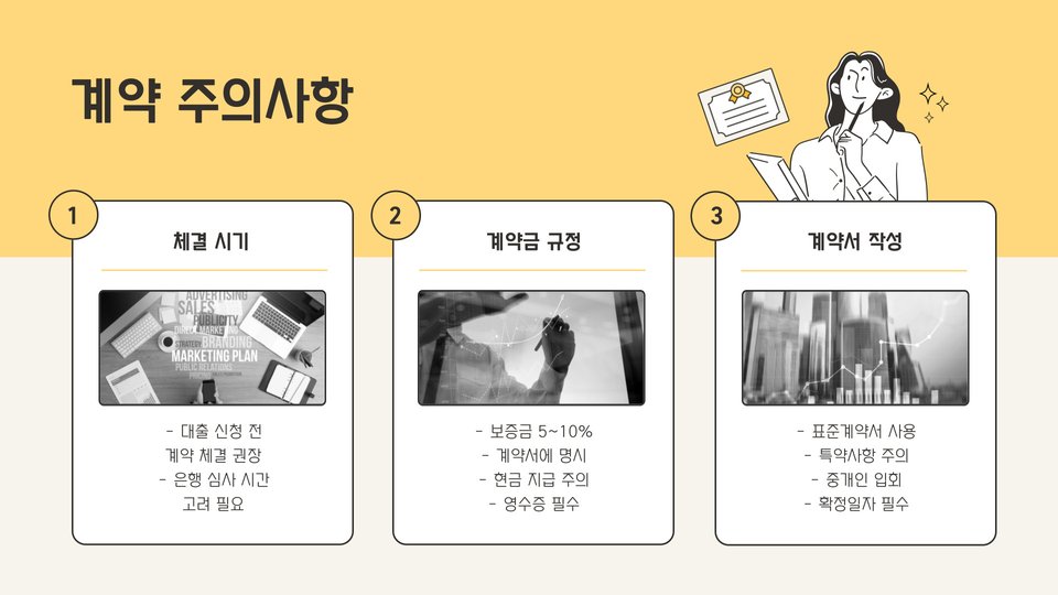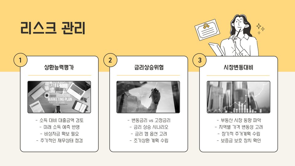 • 대출 이자율 및 기간을 신중히 고려해야 합니다.