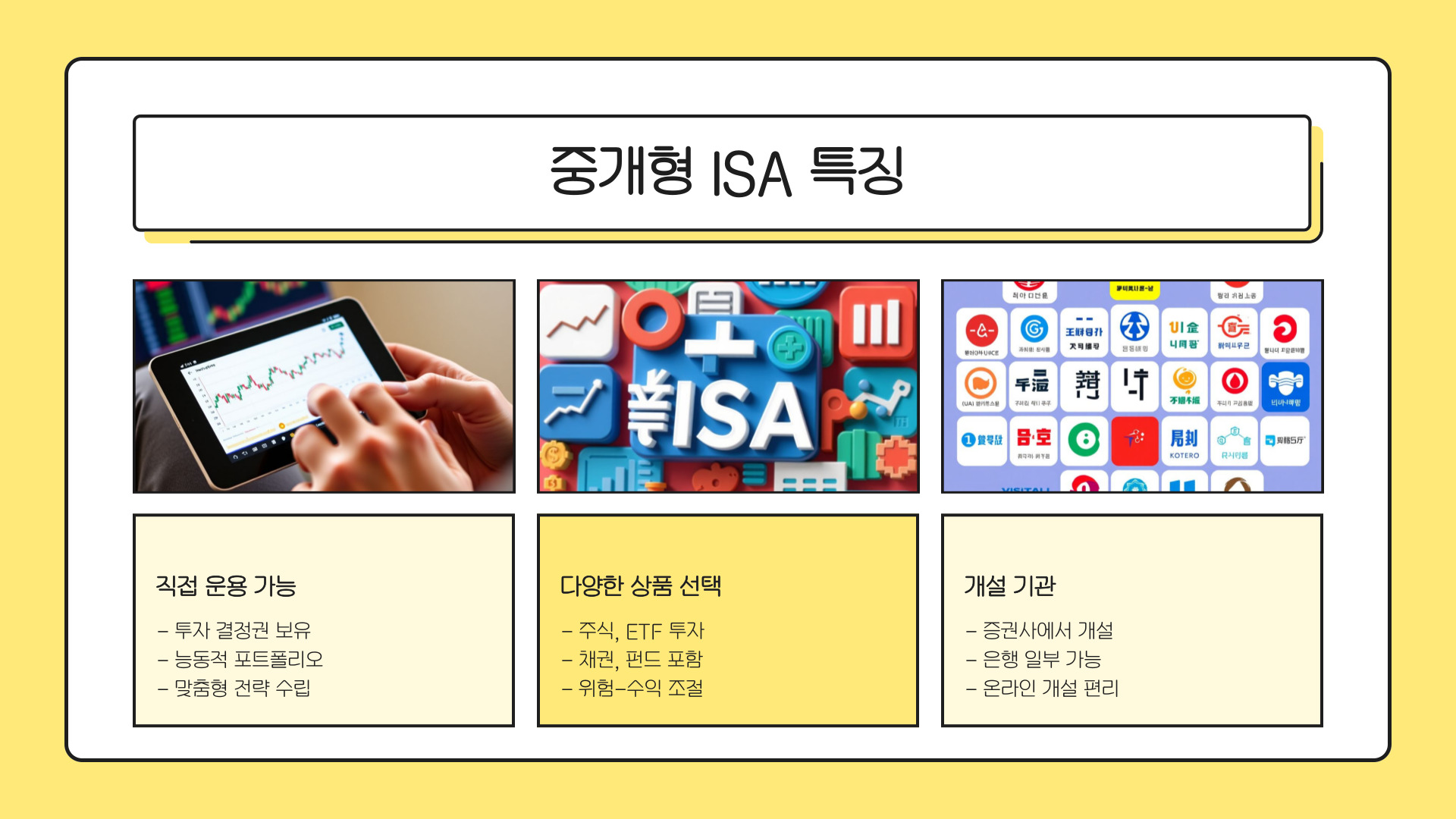 중개형 ISA 계좌는 주식, 채권, 펀드 등 다양한 자산에 투자할 수 있는 계좌로, 투자자에게 세금 면제 혜택을 제공합니다. 이 계좌를 통해 얻은 투자 수익에 대해 세금을 부과받지 않기 때문에, 투자자들은 보다 유리한 조건으로 자산을 증대시킬 수 있습니다. 특히, 중개형 ISA는 직접 주식 거래를 지원하므로, 투자자가 직접 투자 결정을 할 수 있는 점이 큰 장점입니다.
