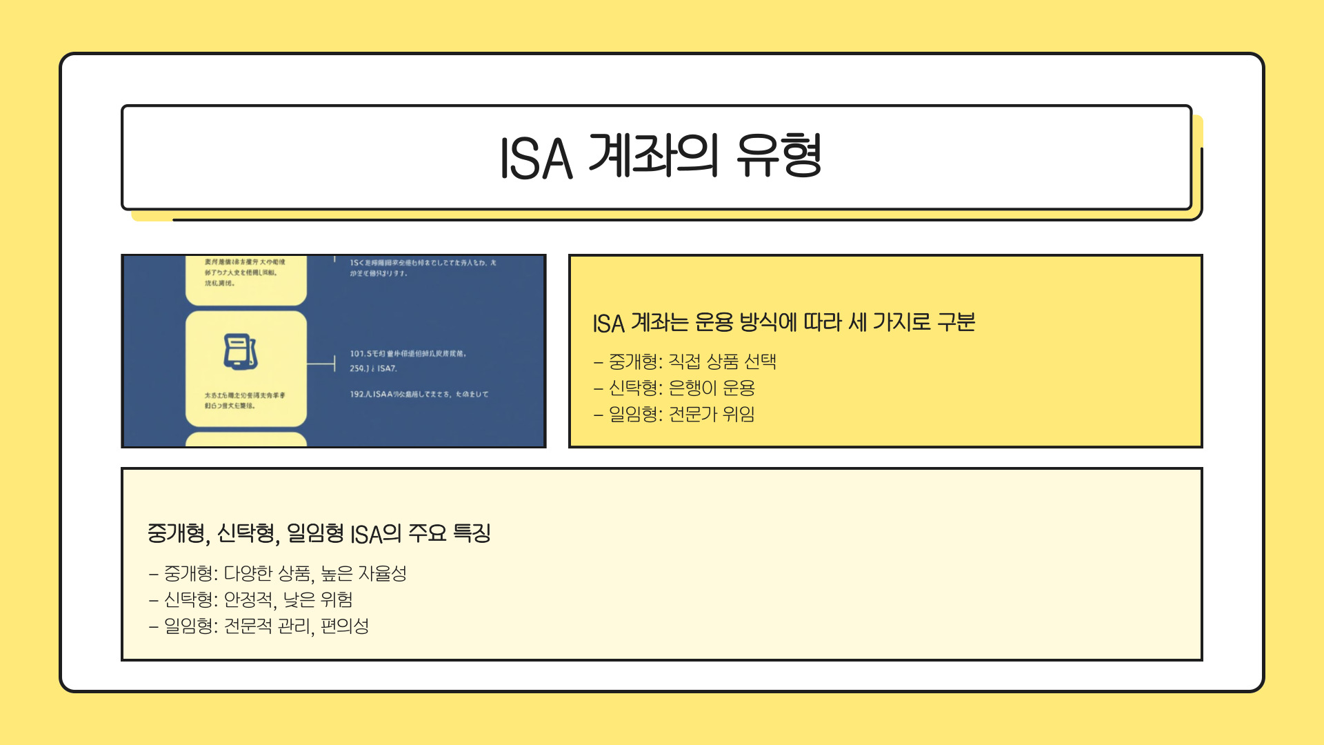 중개형 ISA 계좌는 정기예금형 ISA와 펀드형 ISA와 차별화된 점이 있습니다. 정기예금형 ISA는 안정적인 이자 수익을 추구하는 투자자에게 적합하며, 펀드형 ISA는 다양한 펀드에 투자할 수 있는 장점을 제공합니다. 반면, 중개형 ISA는 직접 주식 거래가 가능하여 높은 수익을 추구하는 투자자에게 유리합니다.