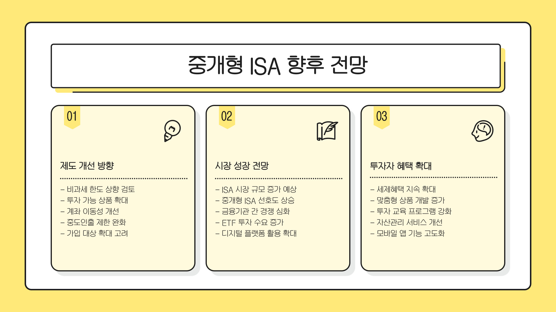 중개형 ISA 계좌는 다양한 투자 옵션과 세금 혜택을 통해 투자자에게 큰 장점을 제공합니다. 계좌 개설 방법과 유의사항, 다른 유형의 ISA와의 비교를 통해, 보다 나은 선택을 할 수 있는 기회를 제공하고자 하였습니다. 투자는 항상 리스크가 동반되므로, 자신의 투자 성향과 목표를 명확히 하고 신중하게 접근하는 것이 중요합니다.
