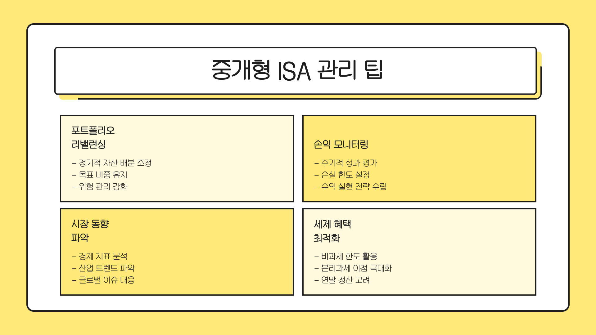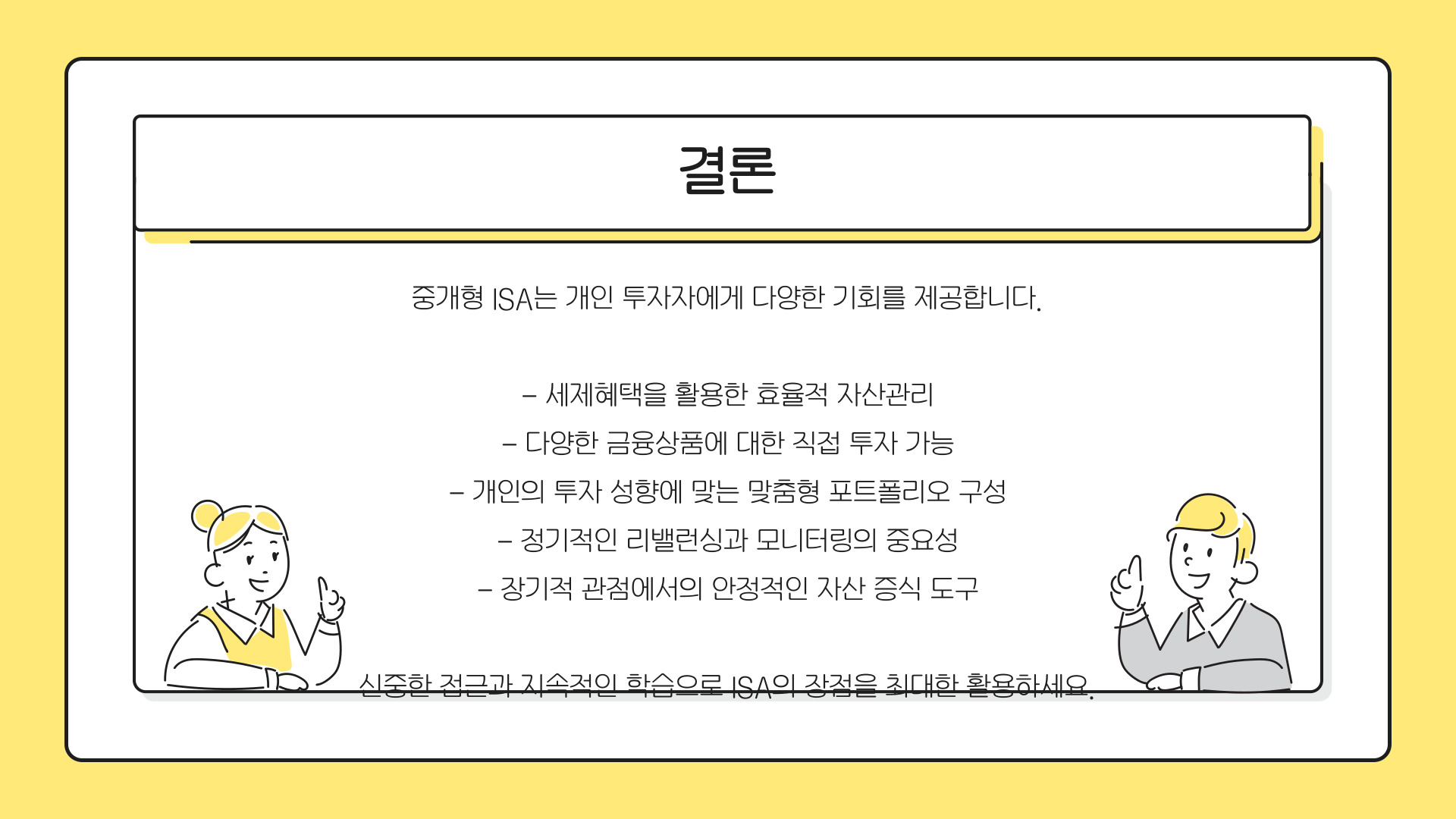 중개형 ISA 계좌는 세금 혜택과 유연성을 통해 개인 투자자에게 많은 장점을 제공합니다. 그러나, 투자 리스크와 수수료 문제 등도 고려해야 하며, 충분한 정보를 바탕으로 선택하는 것이 중요합니다. 자신의 투자 스타일과 목표에 따라 중개형 ISA 계좌를 활용하여 자산을 효율적으로 운영해 보시기 바랍니다.