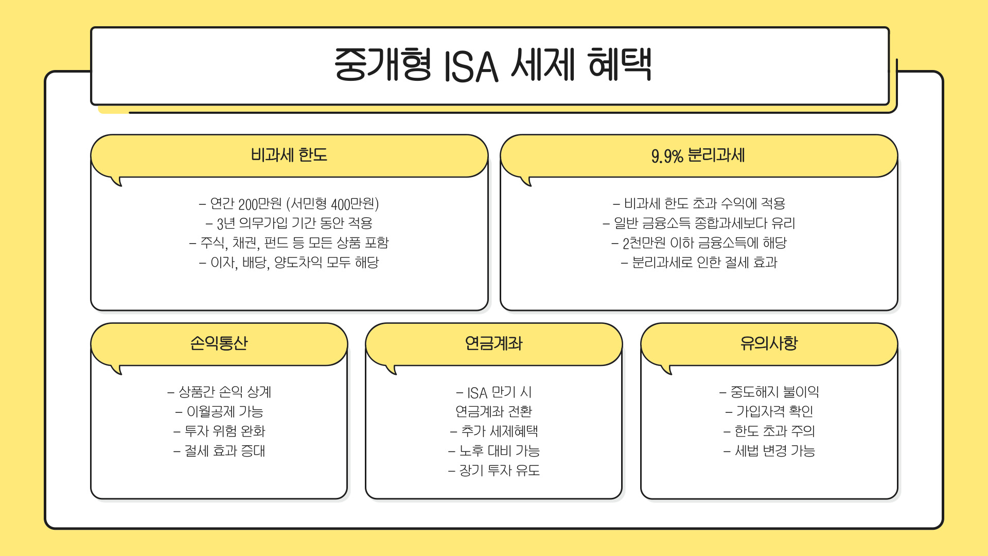 중개형 ISA 계좌에는 다양한 장점이 존재합니다. 첫 번째로, 세금 혜택이 있습니다. 해당 계좌 내에서 발생하는 수익은 소득세와 자본 이득세가 면제되며, 이는 개인 투자자에게 큰 메리트가 됩니다. 또한, 투자 가능 자산의 범위가 넓어 투자자에게 유연성을 제공하며, 주식, 채권, 펀드 등 다양한 상품 선택이 가능합니다.