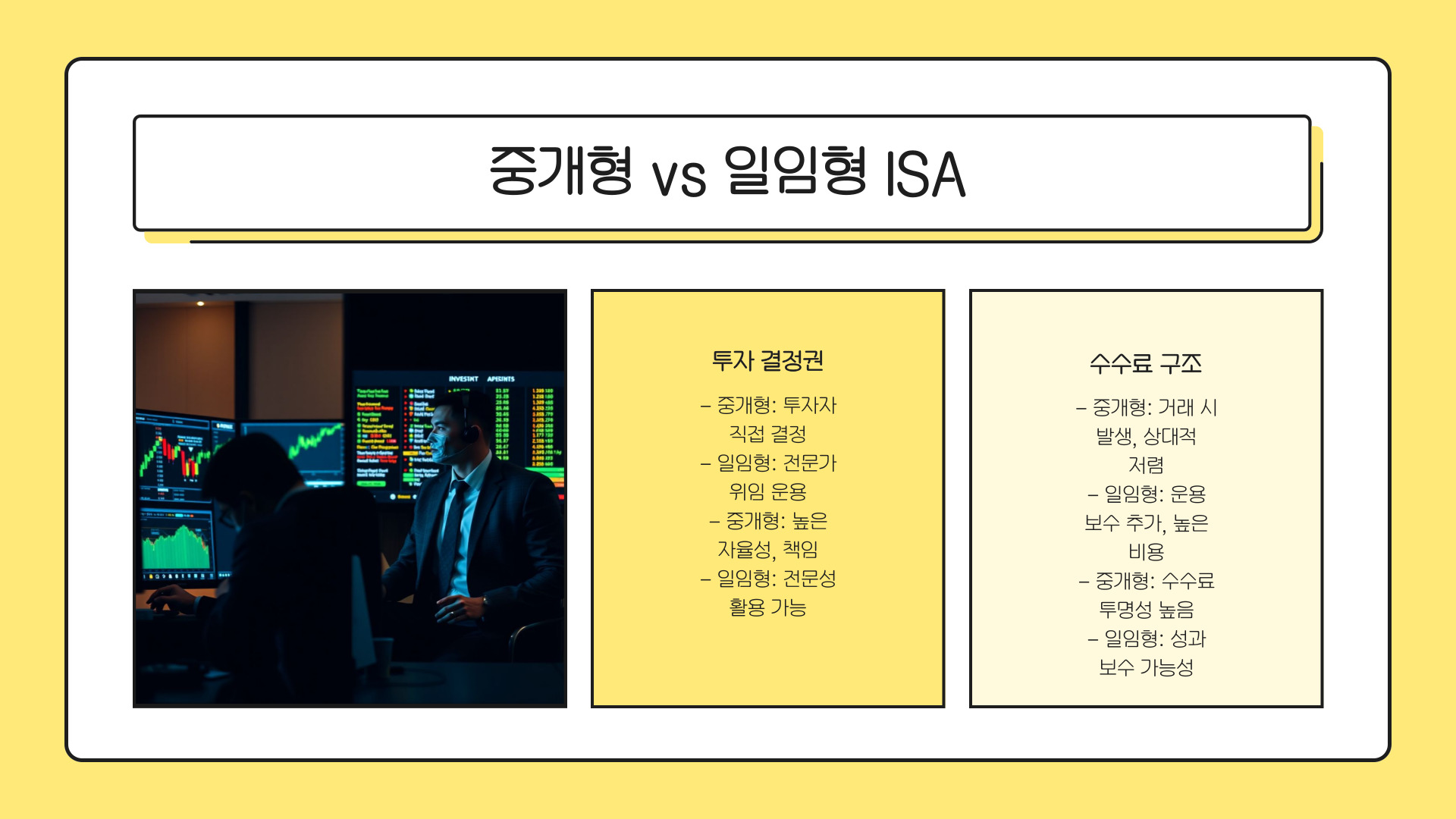그 다음으로, 펀드 계좌와 비교할 때, 중개형 ISA는 개인이 직접 자산을 관리해야 하므로 투자자의 경험과 지식에 따라 성과가 달라질 수 있습니다. 반면, 펀드 계좌는 전문가가 관리하기 때문에 리스크를 분산할 수 있는 장점이 있습니다.